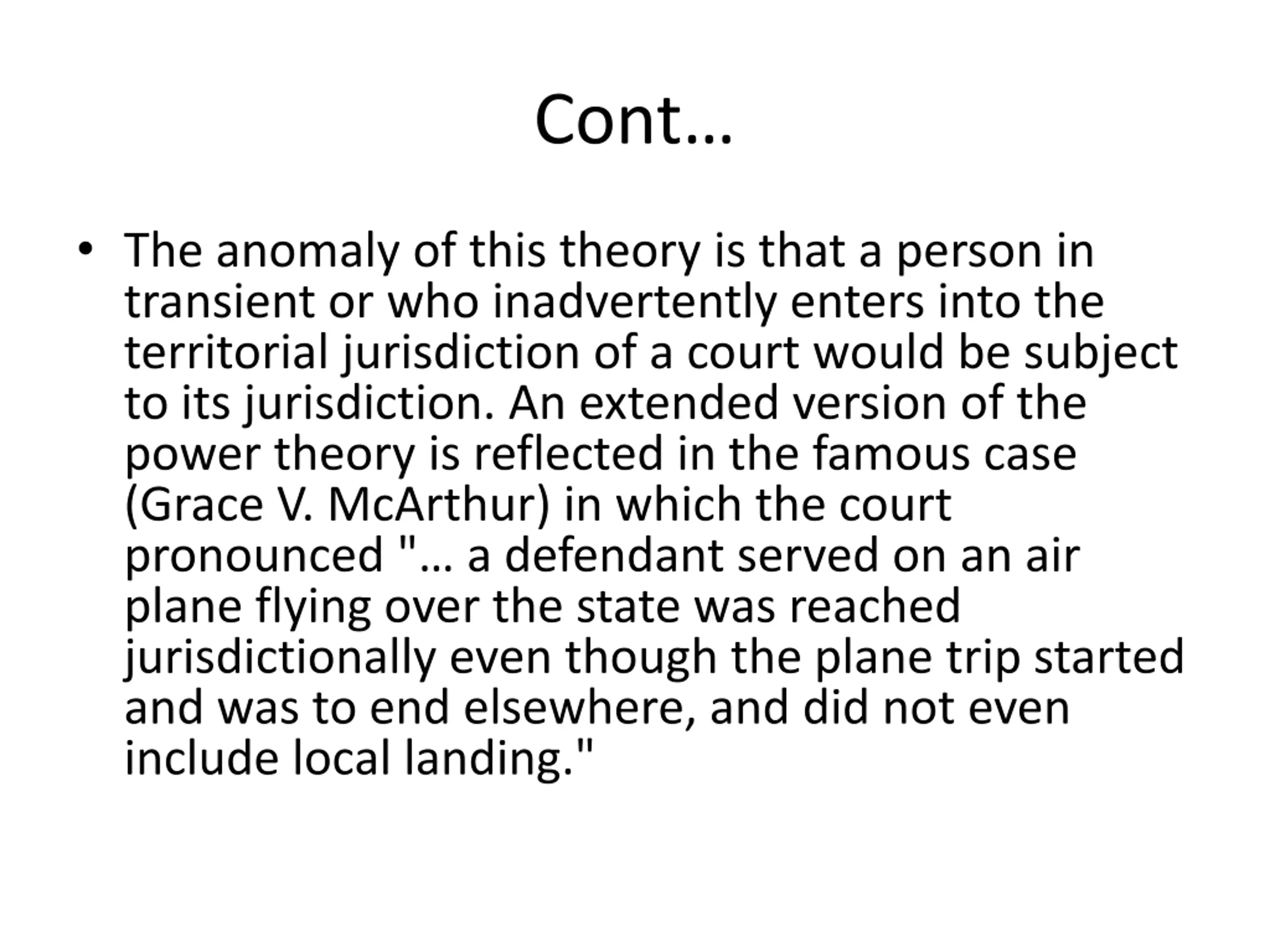 Cont The anomaly of this theory is that a person in transient or who inadvertently enters into the territorial jurisdiction of a court would be subject to its jurisdiction. An extended version of the power theory is reflected in the famous case (Grace V. McArthur) in which the court pronounced " a defendant served on an air plane flying over the state was reached jurisdictionally even though the plane trip started and was to end elsewhere, and did not even include local landing."