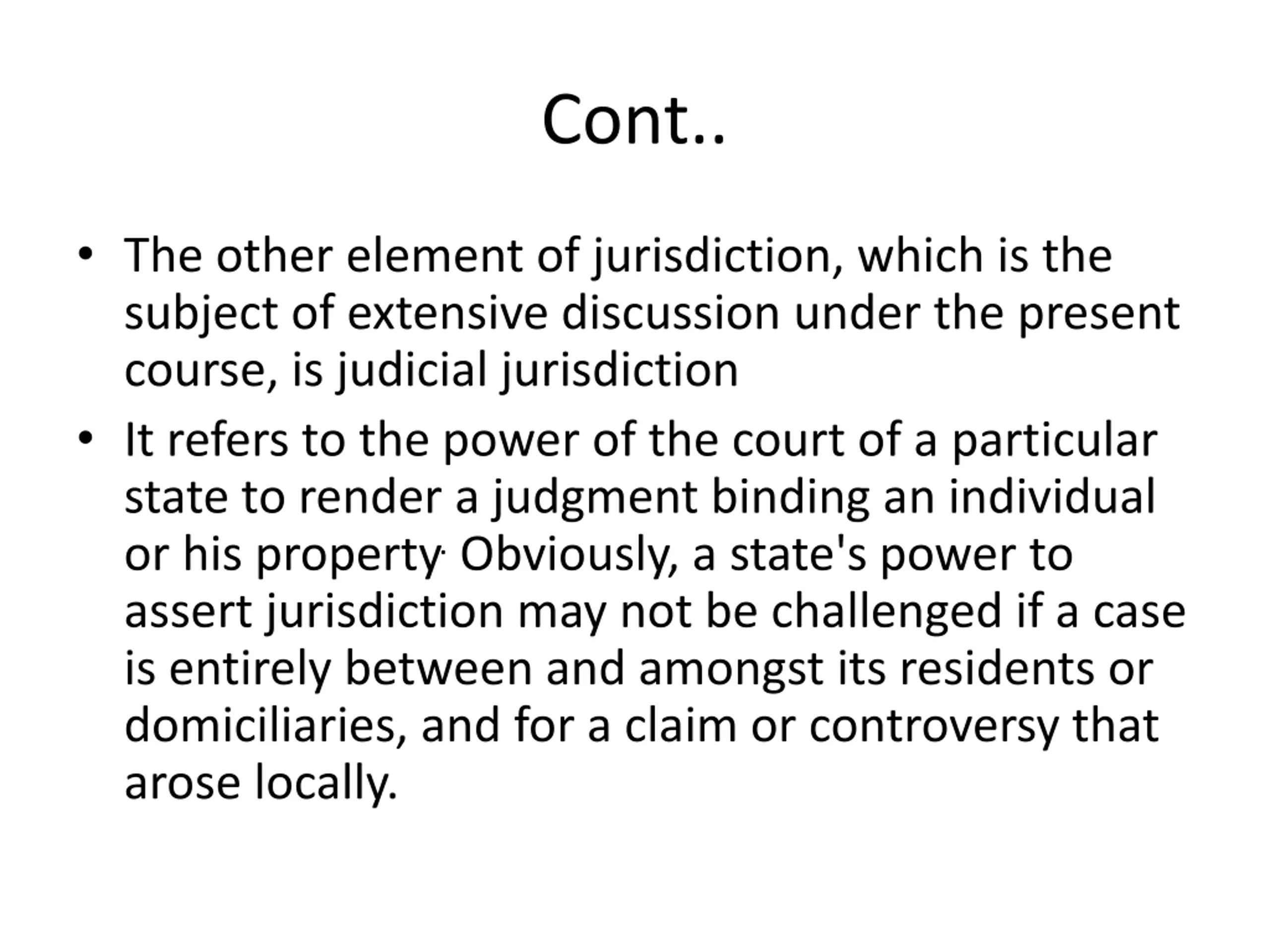 Cont.. The other element of jurisdiction, which is the subject of extensive discussion under the present course, is judicial jurisdiction It refers to the power of the court of a particular state to render a judgment binding an individual or his property.Obviously, a state's power to assert jurisdiction may not be challenged if a case is entirely between and amongst its residents or domiciliaries, and for a claim or controversy that arose locally.