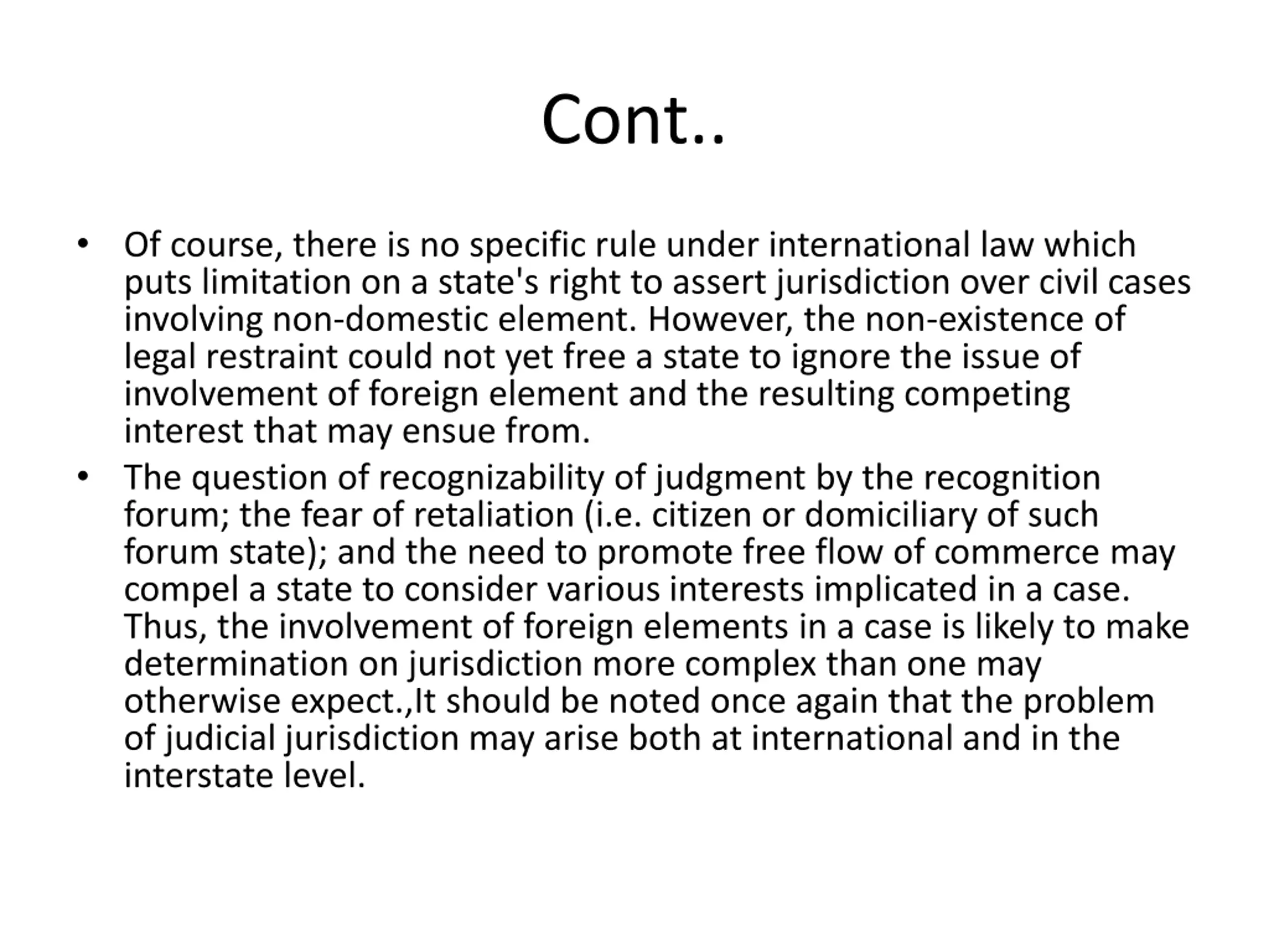 Cont.. Of course, there is no specific rule under international law which puts limitation on a state's right to assert jurisdiction over civil cases involving non-domestic element. However, the non-existence of legal restraint could not yet free a state to ignore the issue of involvement of foreign element and the resulting competing interest that may ensue from. The question of recognizability of judgment by the recognition forum; the fear of retaliation (i.e. citizen or domiciliary of such forum state); and the need to promote free flow of commerce may compel a state to consider various interests implicated in a case. Thus, the involvement of foreign elements in a case is likely to make determination on jurisdiction more complex than one may otherwise expect.,It should be noted once again that the problem of judicial jurisdiction may arise both at international and in the interstate level.