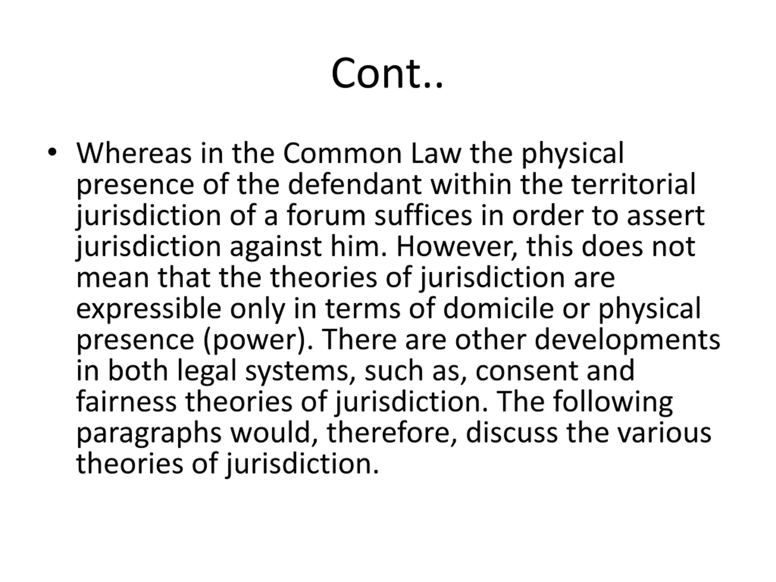 Cont.. Whereas in the Common Law the physical presence of the defendant within the territorial jurisdiction of a forum suffices in order to assert jurisdiction against him. However, this does not mean that the theories of jurisdiction are expressible only in terms of domicile or physical presence (power). There are other developments in both legal systems, such as, consent and fairness theories of jurisdiction. The following paragraphs would, therefore, discuss the various theories of jurisdiction.