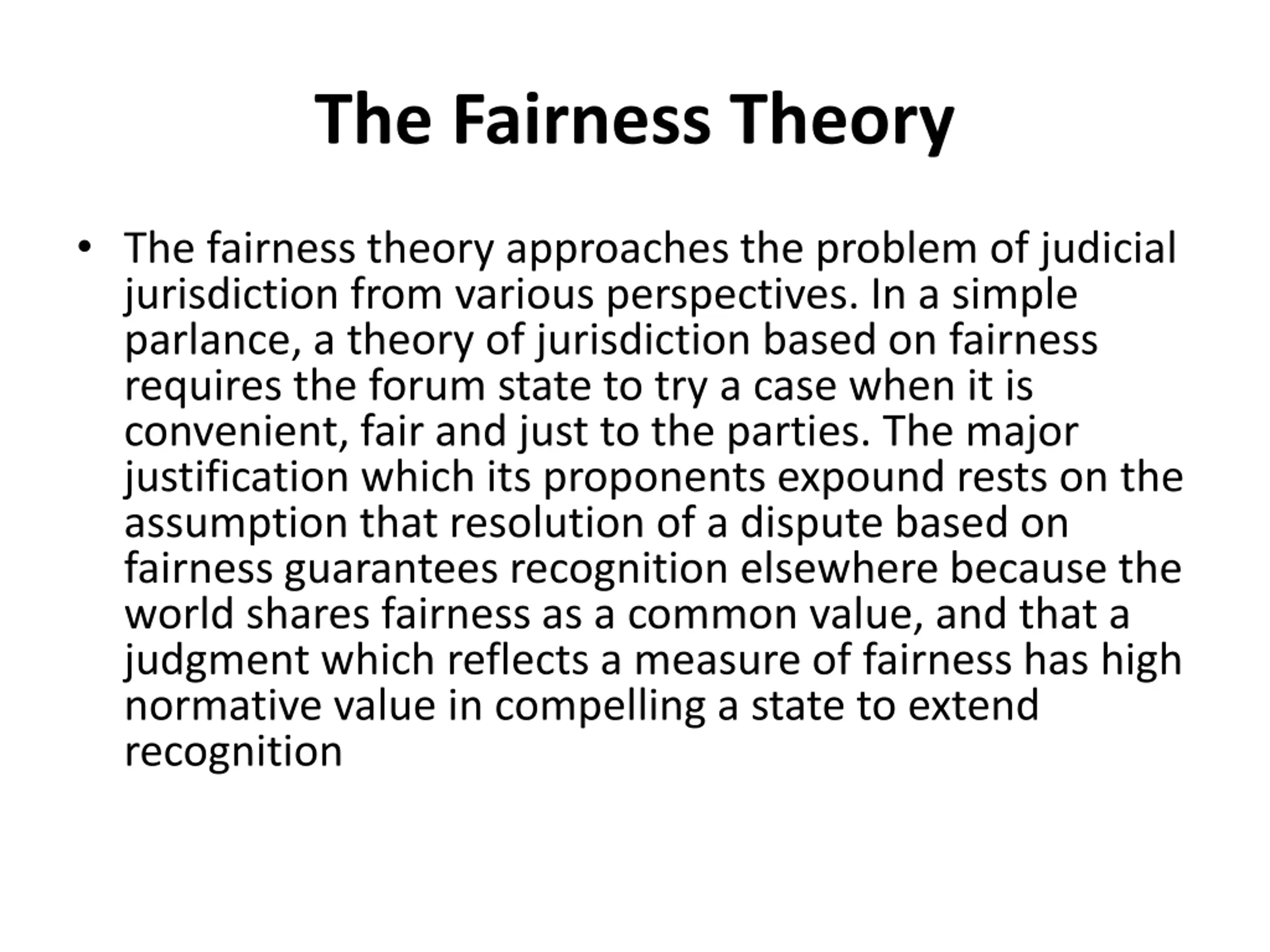 The Fairness Theory The fairness theory approaches the problem of judicial jurisdiction from various perspectives. In a simple parlance, a theory of jurisdiction based on fairness requires the forum state to try a case when it is convenient, fair and just to the parties. The major justification which its proponents expound rests on the assumption that resolution of a dispute based on fairness guarantees recognition elsewhere because the world shares fairness as a common value, and that a judgment which reflects a measure of fairness has high normative value in compelling a state to extend recognition