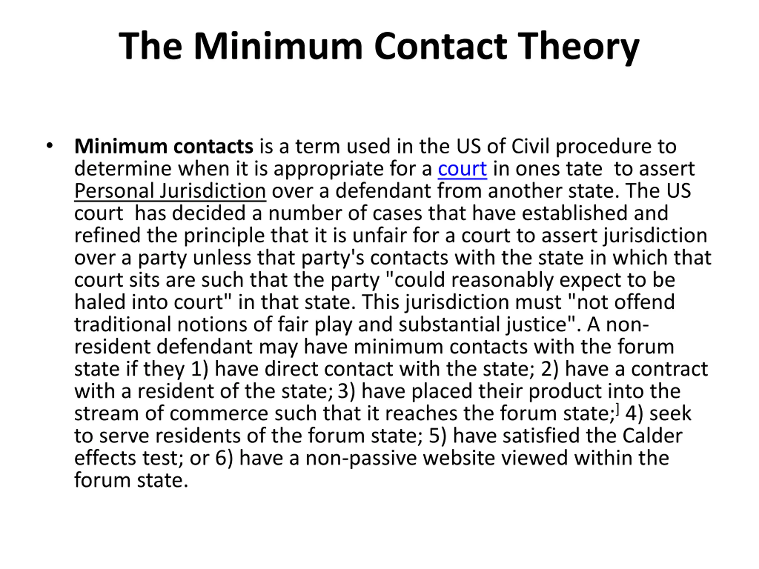 The Minimum Contact Theory Minimum contacts is a term used in the US of Civil procedure to determine when it is appropriate for a court in ones tate to assert Personal Jurisdiction over a defendant from another state. The US court has decided a number of cases that have established and refined the principle that it is unfair for a court to assert jurisdiction over a party unless that party's contacts with the state in which that court sits are such that the party "could reasonably expect to be haled into court" in that state. This jurisdiction must "not offend traditional notions of fair play and substantial justice". A non- resident defendant may have minimum contacts with the forum state if they 1) have direct contact with the state; 2) have a contract with a resident of the state;3) have placed their product into the stream of commerce such that it reaches the forum state;]4) seek to serve residents of the forum state; 5) have satisfied the Calder effects test; or 6) have a non-passive website viewed within the forum state.