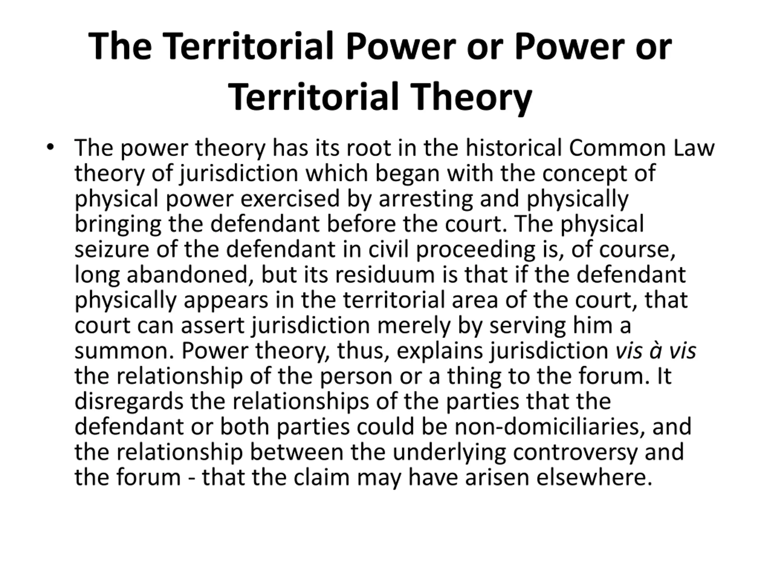 The Territorial Power or Power or Territorial Theory The power theory has its root in the historical Common Law theory of jurisdiction which began with the concept of physical power exercised by arresting and physically bringing the defendant before the court. The physical seizure of the defendant in civil proceeding is, of course, long abandoned, but its residuum is that if the defendant physically appears in the territorial area of the court, that court can assert jurisdiction merely by serving him a summon. Power theory, thus, explains jurisdiction vis vis the relationship of the person or a thing to the forum. It disregards the relationships of the parties that the defendant or both parties could be non-domiciliaries, and the relationship between the underlying controversy and the forum - that the claim may have arisen elsewhere.