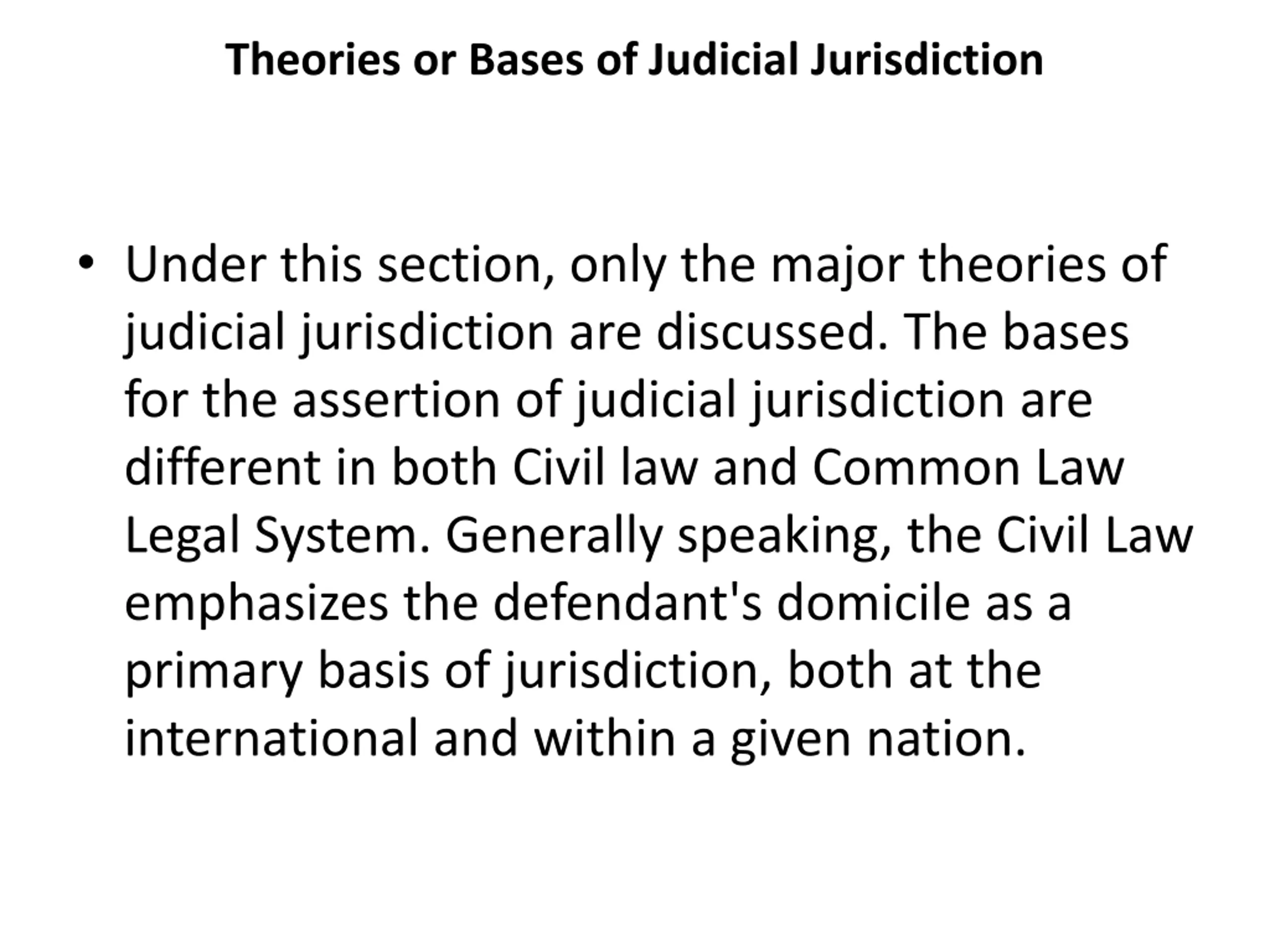 Theories or Bases of Judicial Jurisdiction Under this section, only the major theories of judicial jurisdiction are discussed. The bases for the assertion of judicial jurisdiction are different in both Civil law and Common Law Legal System. Generally speaking, the Civil Law emphasizes the defendant's domicile as a primary basis of jurisdiction, both at the international and within a given nation.