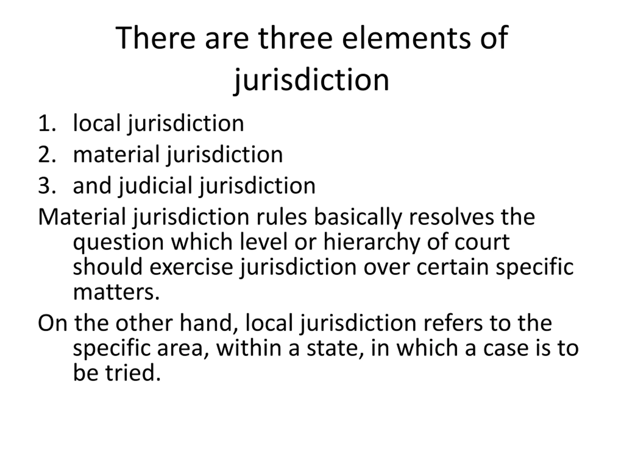 There are three elements of jurisdiction 1. local jurisdiction 2. material jurisdiction 3. and judicial jurisdiction Material jurisdiction rules basically resolves the question which level or hierarchy of court should exercise jurisdiction over certain specific matters. On the other hand, local jurisdiction refers to the specific area, within a state, in which a case is to be tried.