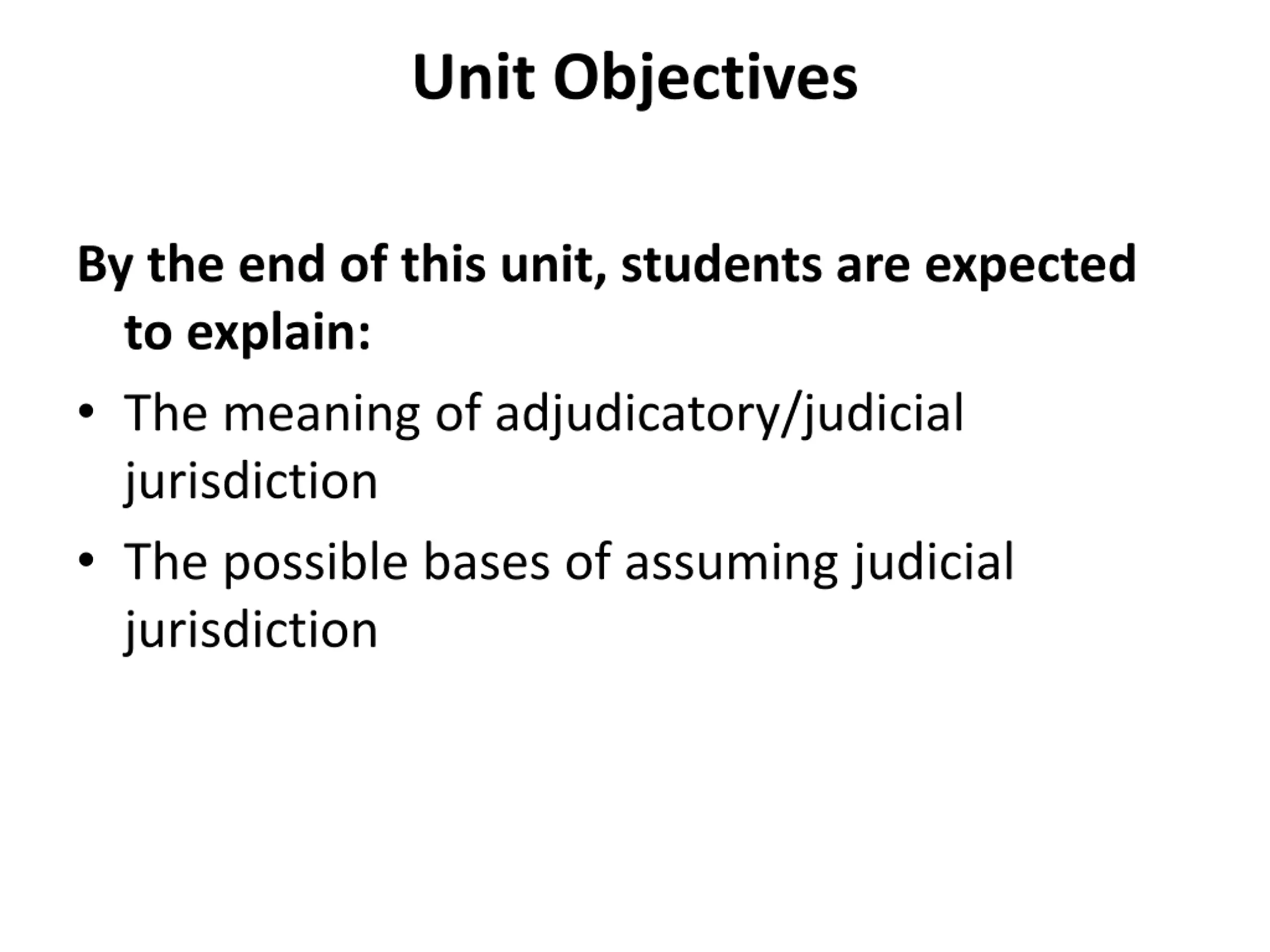 Unit Objectives By the end of this unit, students are expected to explain: The meaning of adjudicatory/judicial jurisdiction The possible bases of assuming judicial jurisdiction