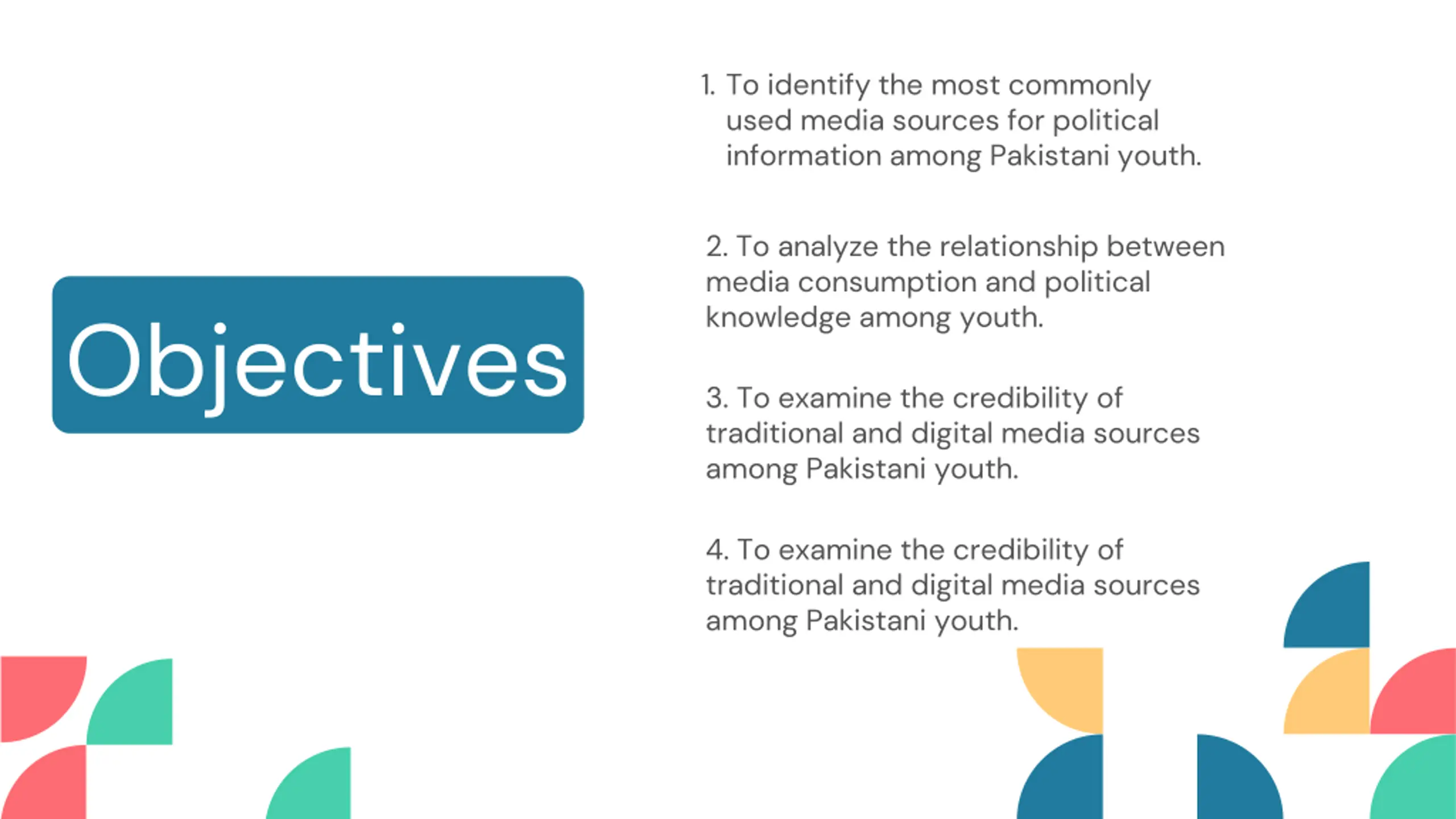 1. To identify the most commonly used media sources for political information among Pakistani youth. 2. To analyze the relationship between media consumption and political knowledge among youth. Objectives 3. To examine the credibility of traditional and digital media sources among Pakistani youth. 4. To examine the credibility of traditional and digital media sources among Pakistani youth.