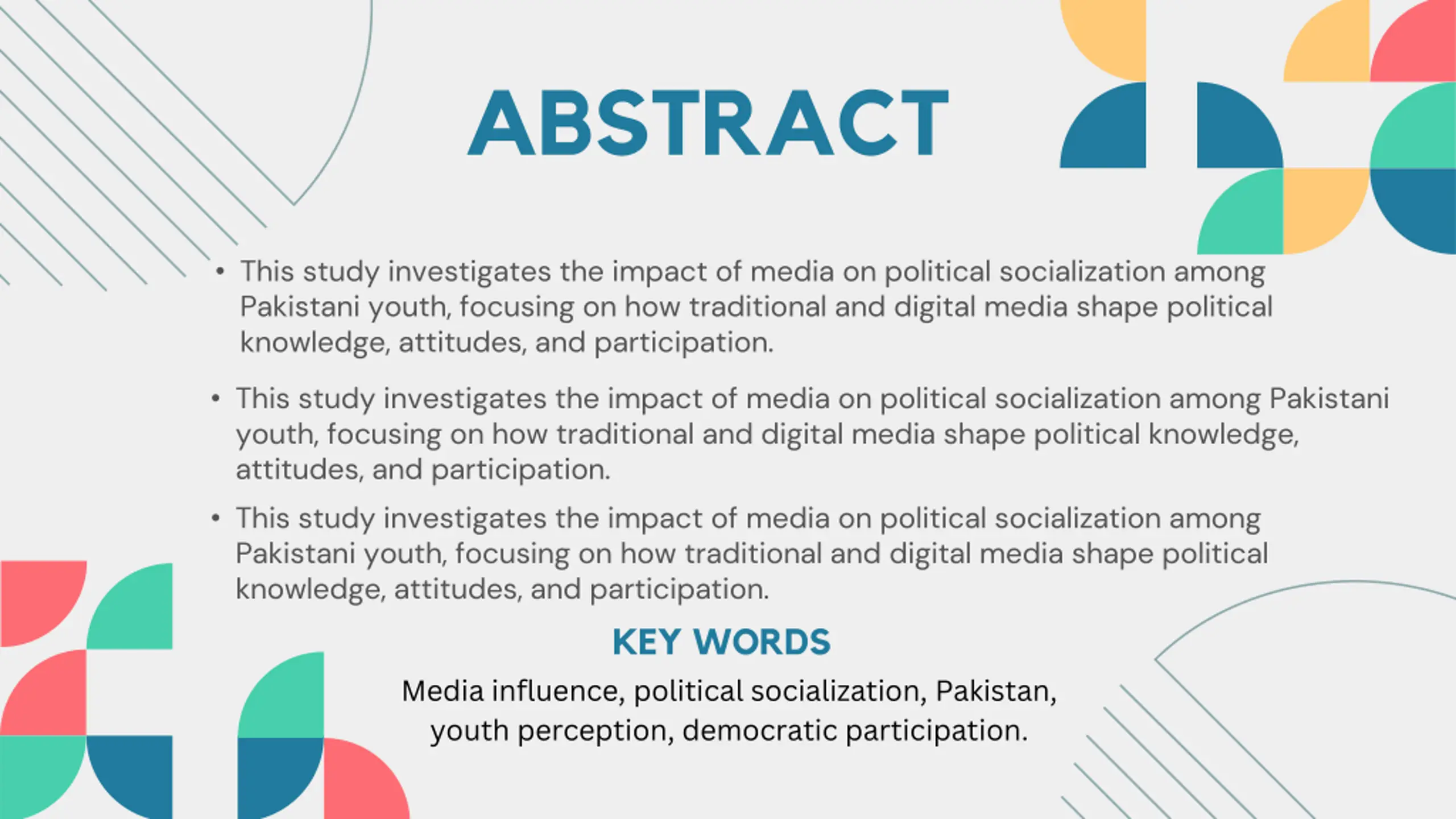 ABSTRACT This study investigates the impact of media on political socialization among Pakistani youth, focusing on how traditional and digital media shape political knowledge, attitudes, and participation. This study investigates the impact of media on political socialization among Pakistani youth, focusing on how traditional and digital media shape political knowledge, attitudes, and participation. This study investigates the impact of media on political socialization among Pakistani youth, focusing on how traditional and digital media shape political knowledge, attitudes, and participation. KEY WORDS Media influence, political socialization, Pakistan, youth perception, democratic participation.