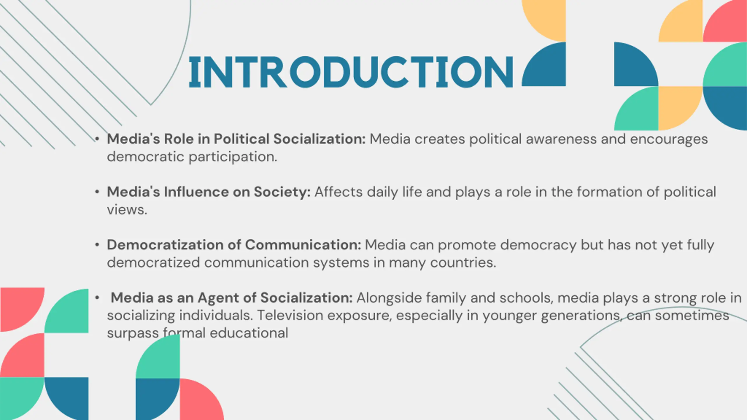 INTRODUCTION Media's Role in Political Socialization: Media creates political awareness and encourages democratic participation. Media's Influence on Society: Affects daily life and plays a role in the formation of political views. Democratization of Communication: Media can promote democracy but has not yet fully democratized communication systems in many countries. Media as an Agent of Socialization: Alongside family and schools, media plays a strong role in socializing individuals. Television exposure, especially in younger generations, can sometimes surpass formal educational
