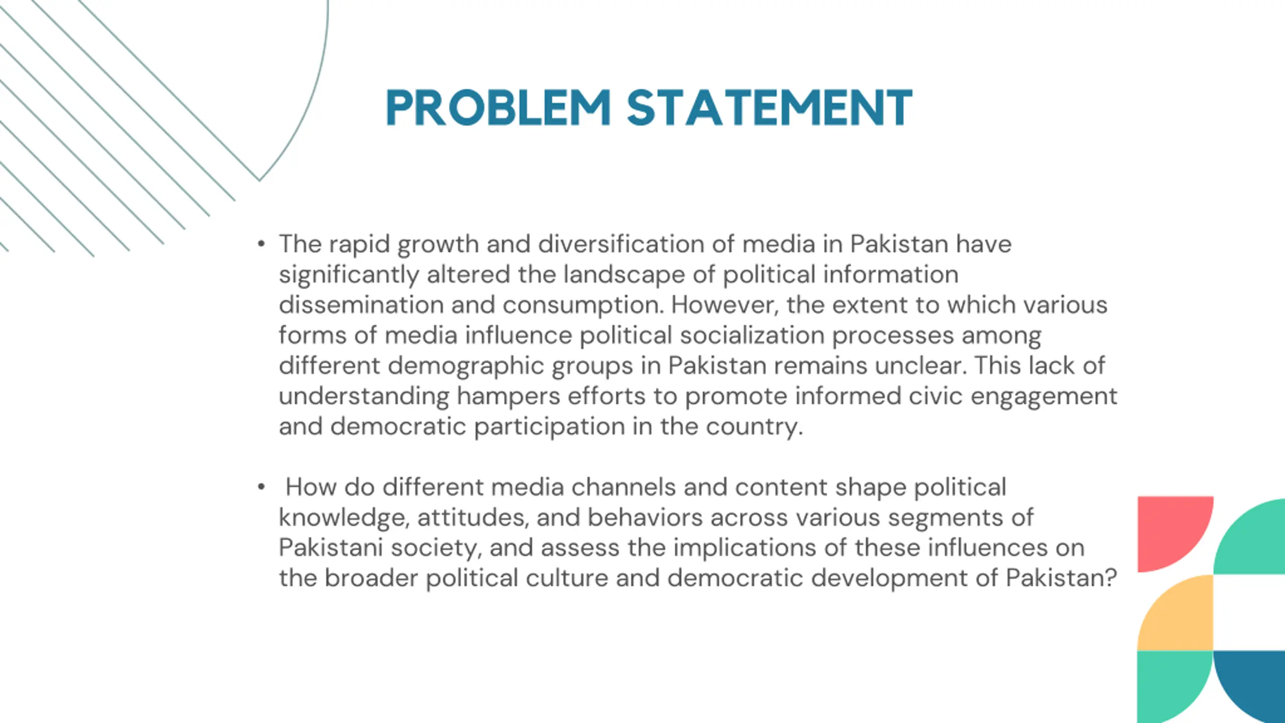 PROBLEM STATEMENT The rapid growth and diversification of media in Pakistan have significantly altered the landscape of political information dissemination and consumption. However, the extent to which various forms of media influence political socialization processes among different demographic groups in Pakistan remains unclear. This lack of understanding hampers efforts to promote informed civic engagement and democratic participation in the country. How do different media channels and content shape political knowledge, attitudes, and behaviors across various segments of Pakistani society, and assess the implications of these influences on the broader political culture and democratic development of Pakistan?