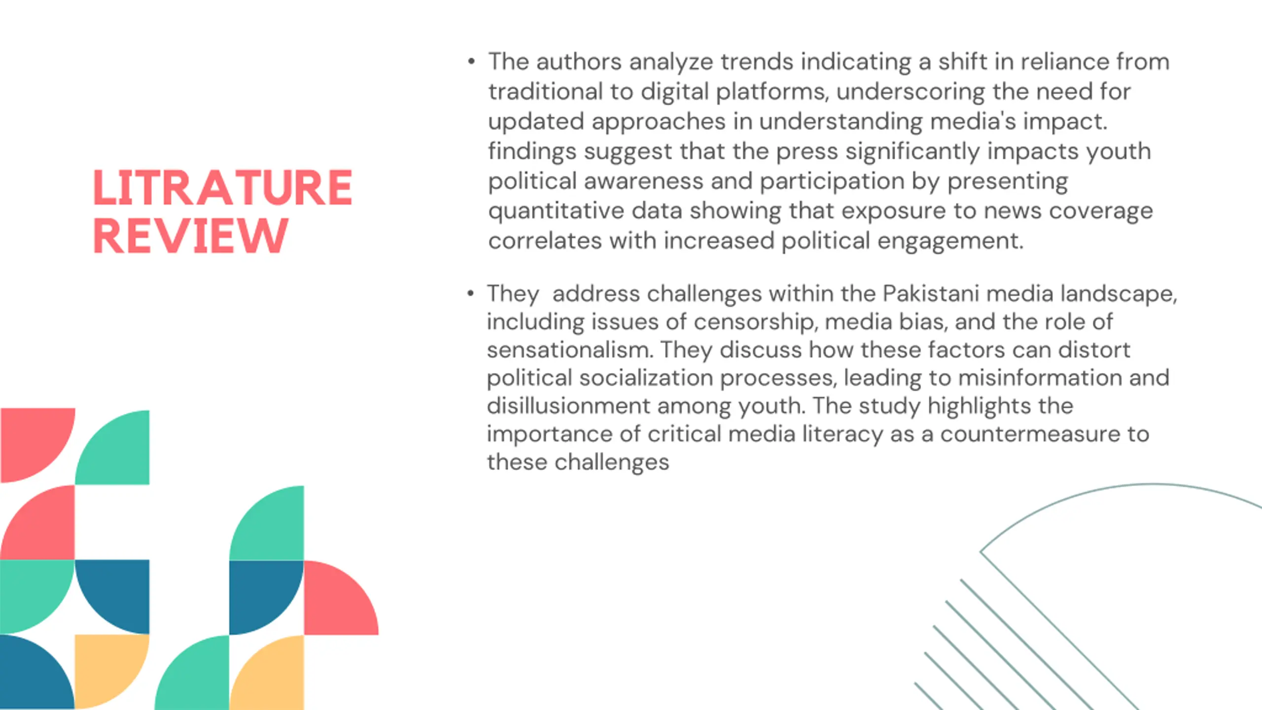 The authors analyze trends indicating a shift in reliance from traditional to digital platforms, underscoring the need for updated approaches in understanding media's impact. findings suggest that the press significantly impacts youth political awareness and participation by presenting quantitative data showing that exposure to news coverage correlates with increased political engagement. LITRATURE REVIEW They address challenges within the Pakistani media landscape, including issues of censorship, media bias, and the role of sensationalism. They discuss how these factors can distort political socialization processes, leading to misinformation and disillusionment among youth. The study highlights the importance of critical media literacy as a countermeasure to these challenges