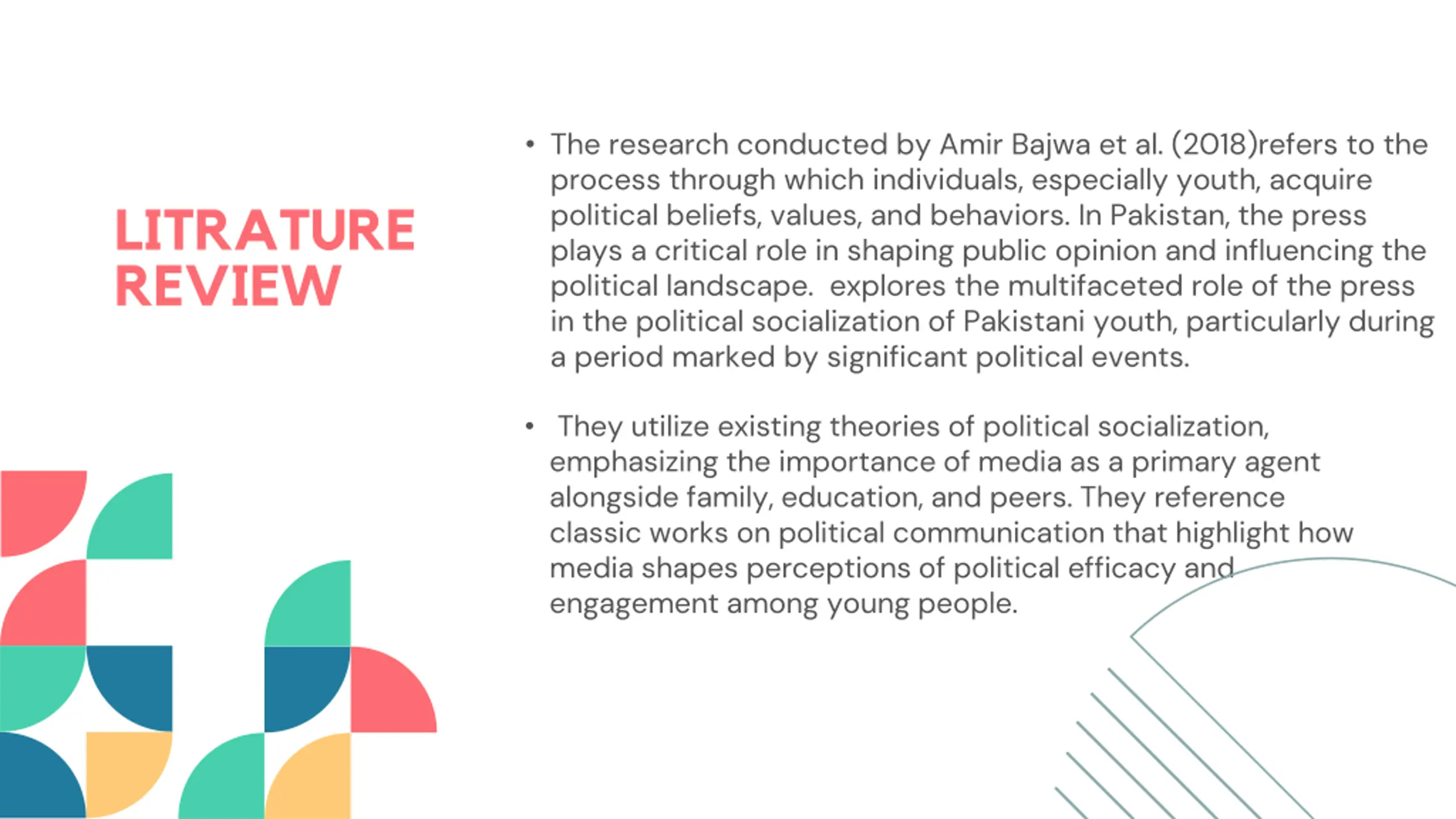 The research conducted by Amir Bajwa et al. (2018)refers to the process through which individuals, especially youth, acquire political beliefs, values, and behaviors. In Pakistan, the press plays a critical role in shaping public opinion and influencing the political landscape. explores the multifaceted role of the press in the political socialization of Pakistani youth, particularly during a period marked by significant political events. LITRATURE REVIEW They utilize existing theories of political socialization, emphasizing the importance of media as a primary agent alongside family, education, and peers. They reference classic works on political communication that highlight how media shapes perceptions of political efficacy and engagement among young people.