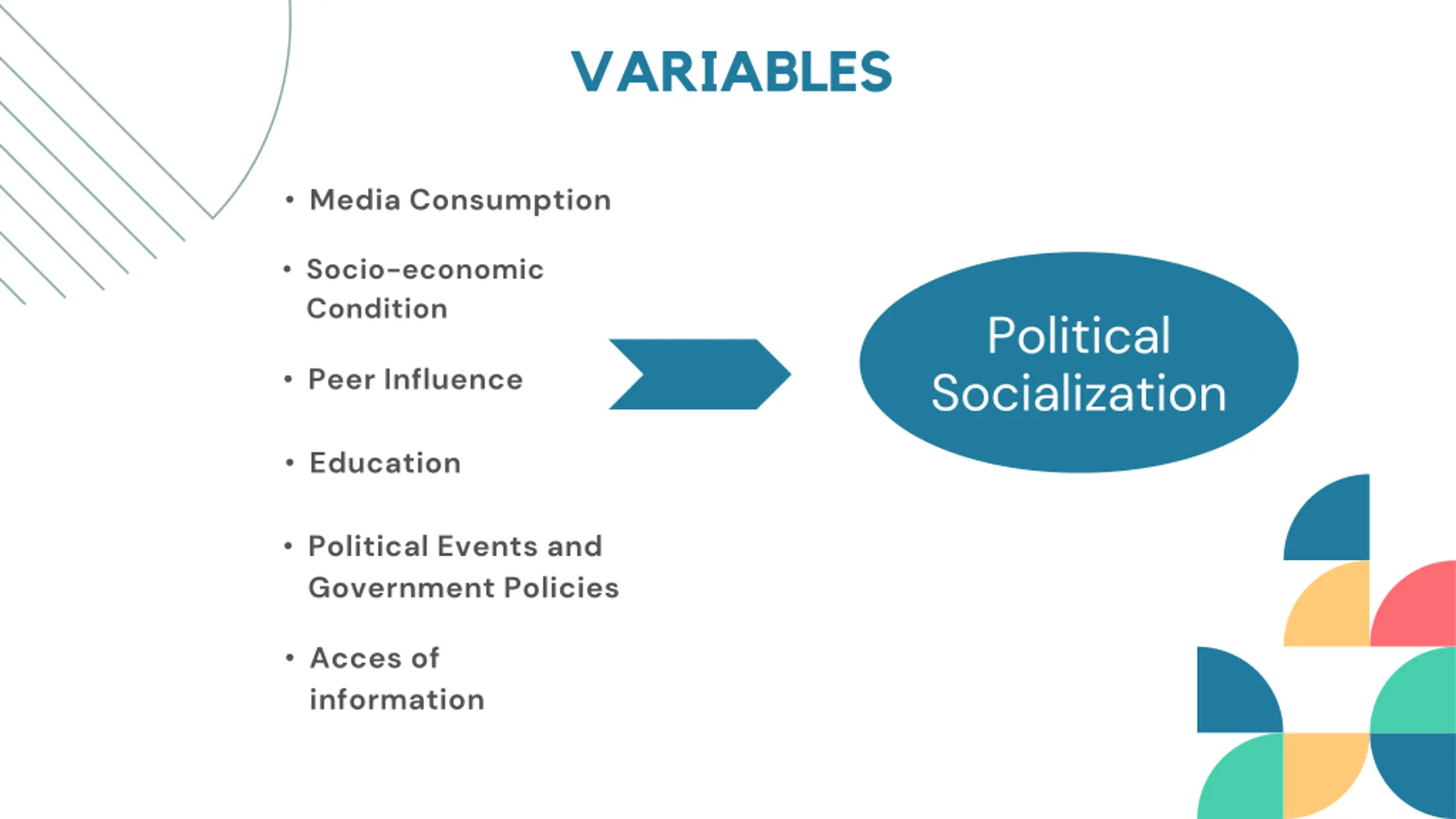 VARIABLES Media Consumption Socio-economic Condition Political Socialization Peer Influence FEB Education JAN Political Events and Government Policies Acces of information