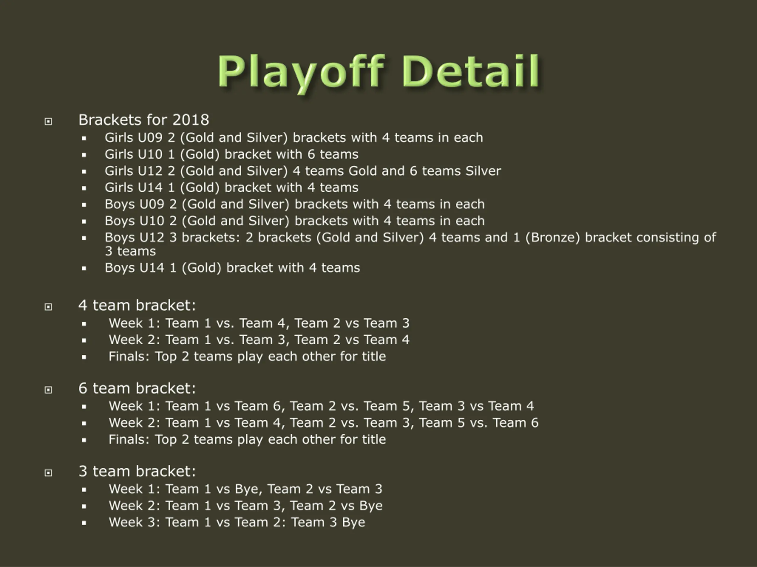 Brackets for 2018 Girls U09 2 (Gold and Silver) brackets with 4 teams in each Girls U10 1 (Gold) bracket with 6 teams Girls U12 2 (Gold and Silver) 4 teams Gold and 6 teams Silver Girls U14 1 (Gold) bracket with 4 teams Boys U09 2 (Gold and Silver) brackets with 4 teams in each Boys U10 2 (Gold and Silver) brackets with 4 teams in each Boys U12 3 brackets: 2 brackets (Gold and Silver) 4 teams and 1 (Bronze) bracket consisting of 3 teams Boys U14 1 (Gold) bracket with 4 teams 4 team bracket: Week 1: Team 1 vs. Team 4, Team 2 vs Team 3 Week 2: Team 1 vs. Team 3, Team 2 vs Team 4 Finals: Top 2 teams play each other for title 6 team bracket: Week 1: Team 1 vs Team 6, Team 2 vs. Team 5, Team 3 vs Team 4 Week 2: Team 1 vs Team 4, Team 2 vs. Team 3, Team 5 vs. Team 6 Finals: Top 2 teams play each other for title 3 team bracket: Week 1: Team 1 vs Bye, Team 2 vs Team 3 Week 2: Team 1 vs Team 3, Team 2 vs Bye Week 3: Team 1 vs Team 2: Team 3 Bye