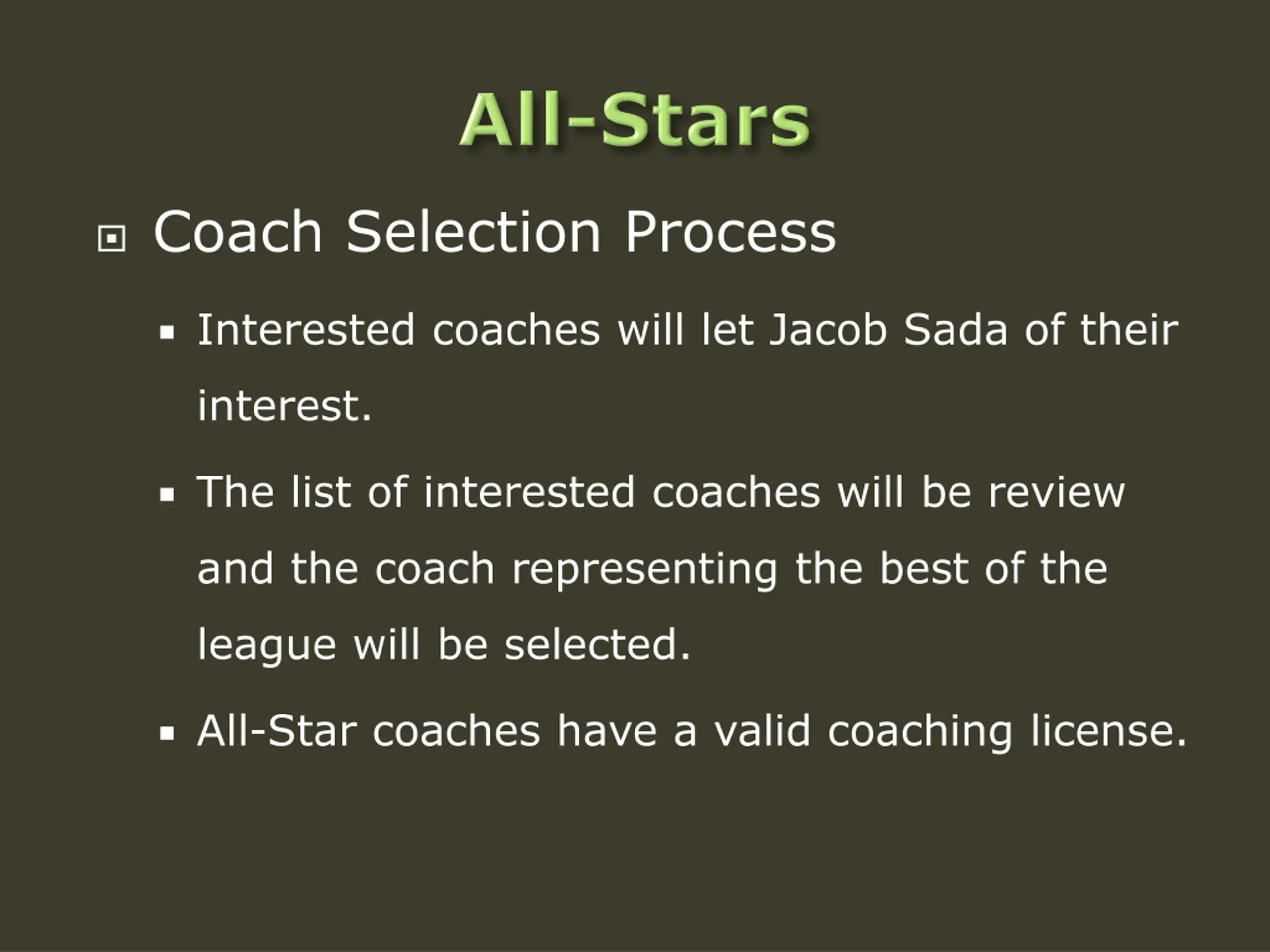 Coach Selection Process Interested coaches will let Jacob Sada of their interest. The list of interested coaches will be review and the coach representing the best of the league will be selected. All-Star coaches have a valid coaching license.