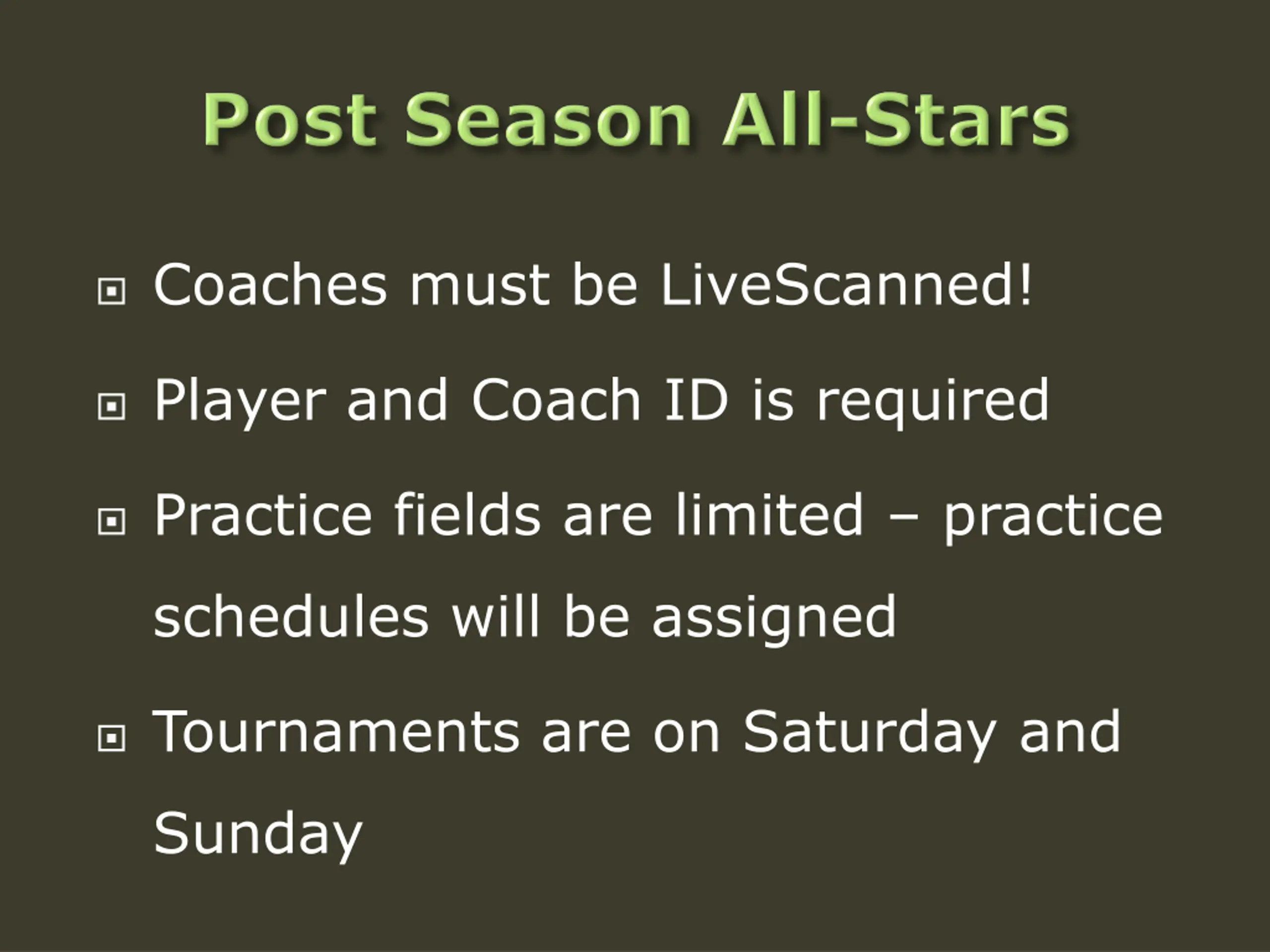 Coaches must be LiveScanned! Player and Coach ID is required Practice fields are limited practice schedules will be assigned Tournaments are on Saturday and Sunday