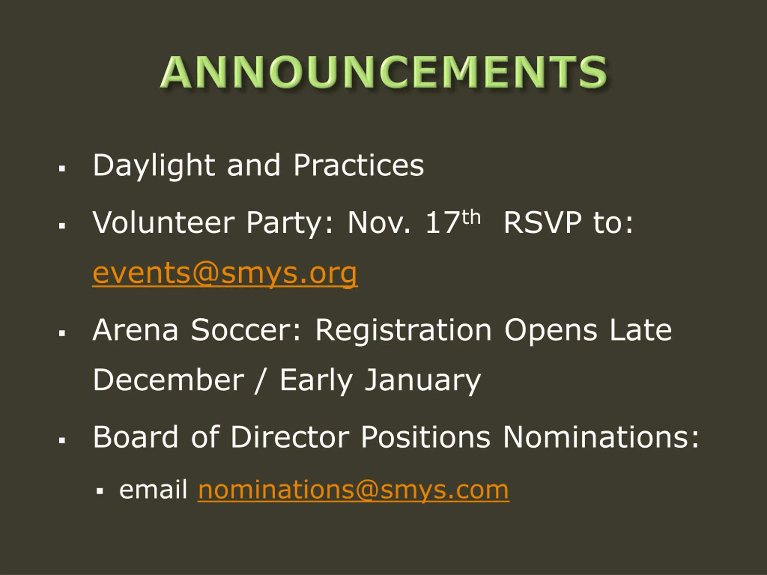 Daylight and Practices Volunteer Party: Nov. 17thRSVP to: events@smys.org Arena Soccer: Registration Opens Late December / Early January Board of Director Positions Nominations: email nominations@smys.com