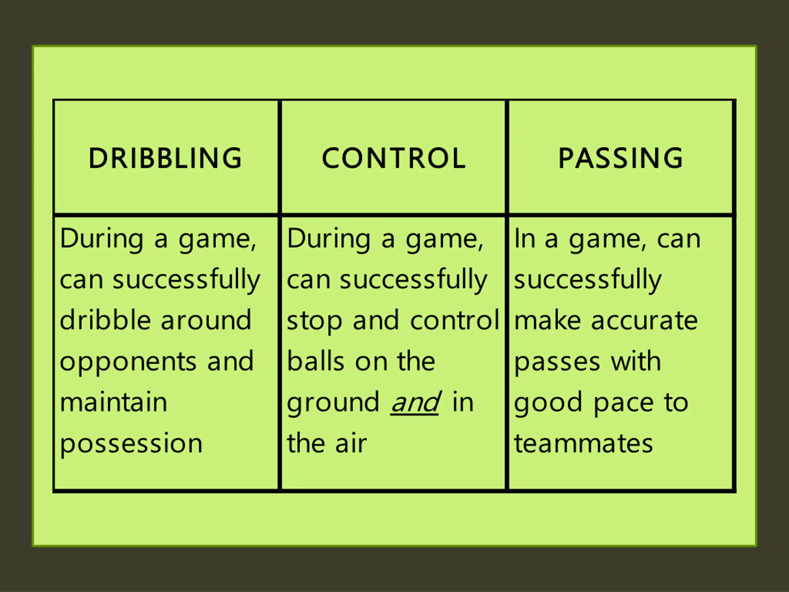 DRIBBLING DRIBBLING CONTROL CONTROL PASSING PASSING During a game, can successfully dribble around opponents and maintain possession During a game, can successfully stop and control balls on the ground and in the air In a game, can successfully make accurate passes with good pace to teammates