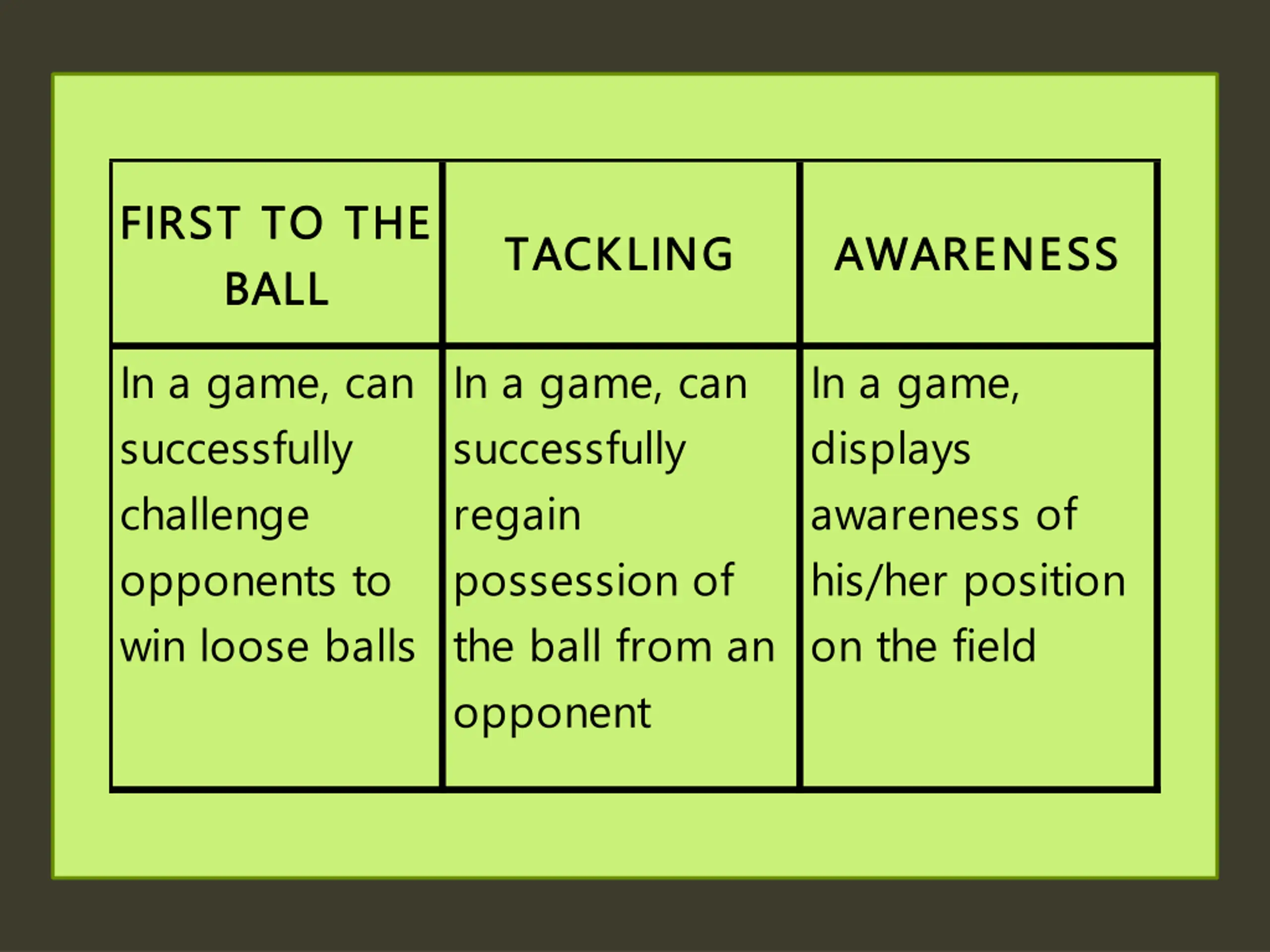 FIRST TO THE FIRST TO THE BALL BALL TACKLING TACKLING AWARENESS AWARENESS In a game, can successfully challenge opponents to win loose balls In a game, can successfully regain possession of the ball from an opponent In a game, displays awareness of his/her position on the field