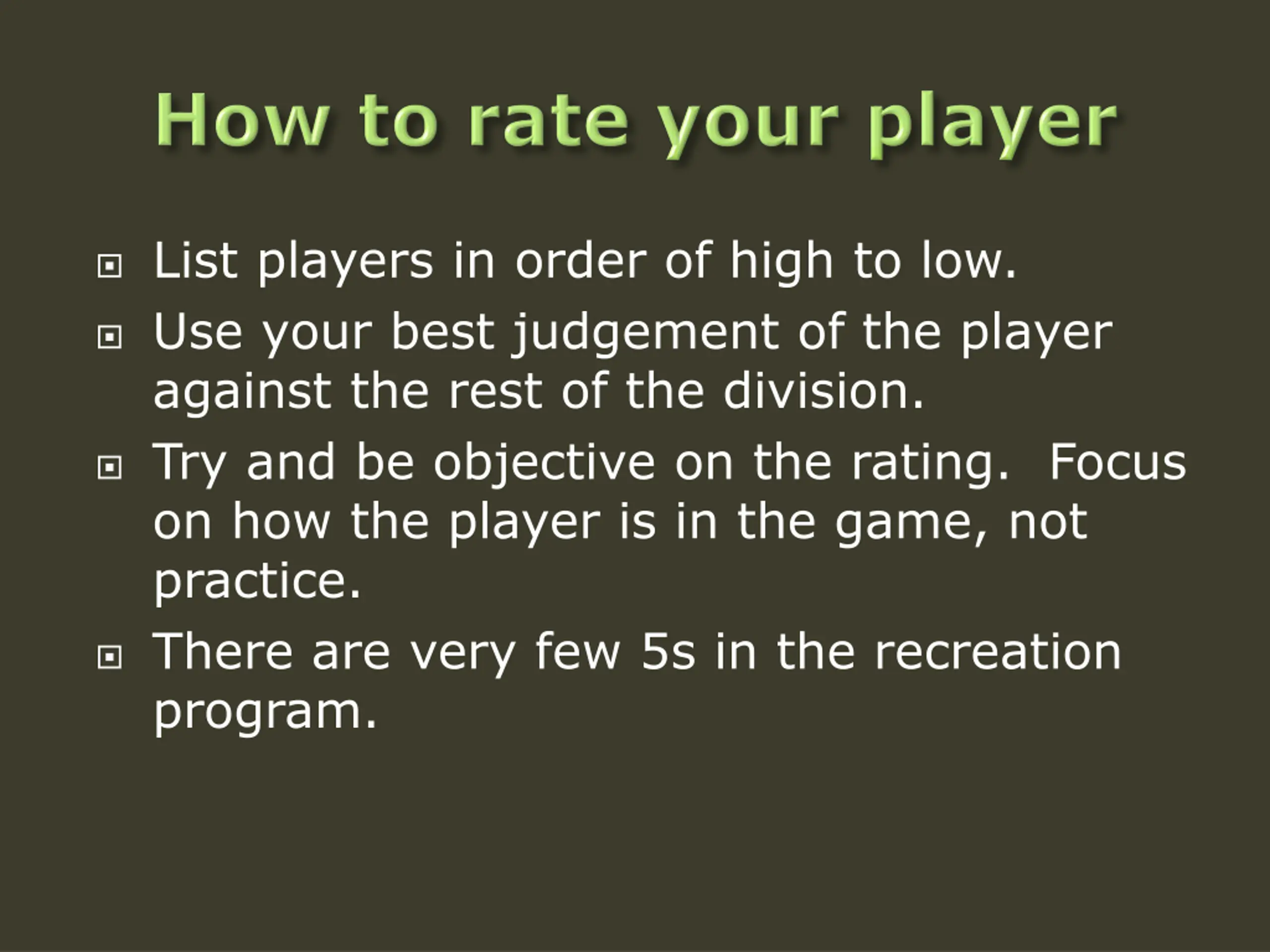 List players in order of high to low. Use your best judgement of the player against the rest of the division. Try and be objective on the rating. Focus on how the player is in the game, not practice. There are very few 5s in the recreation program.