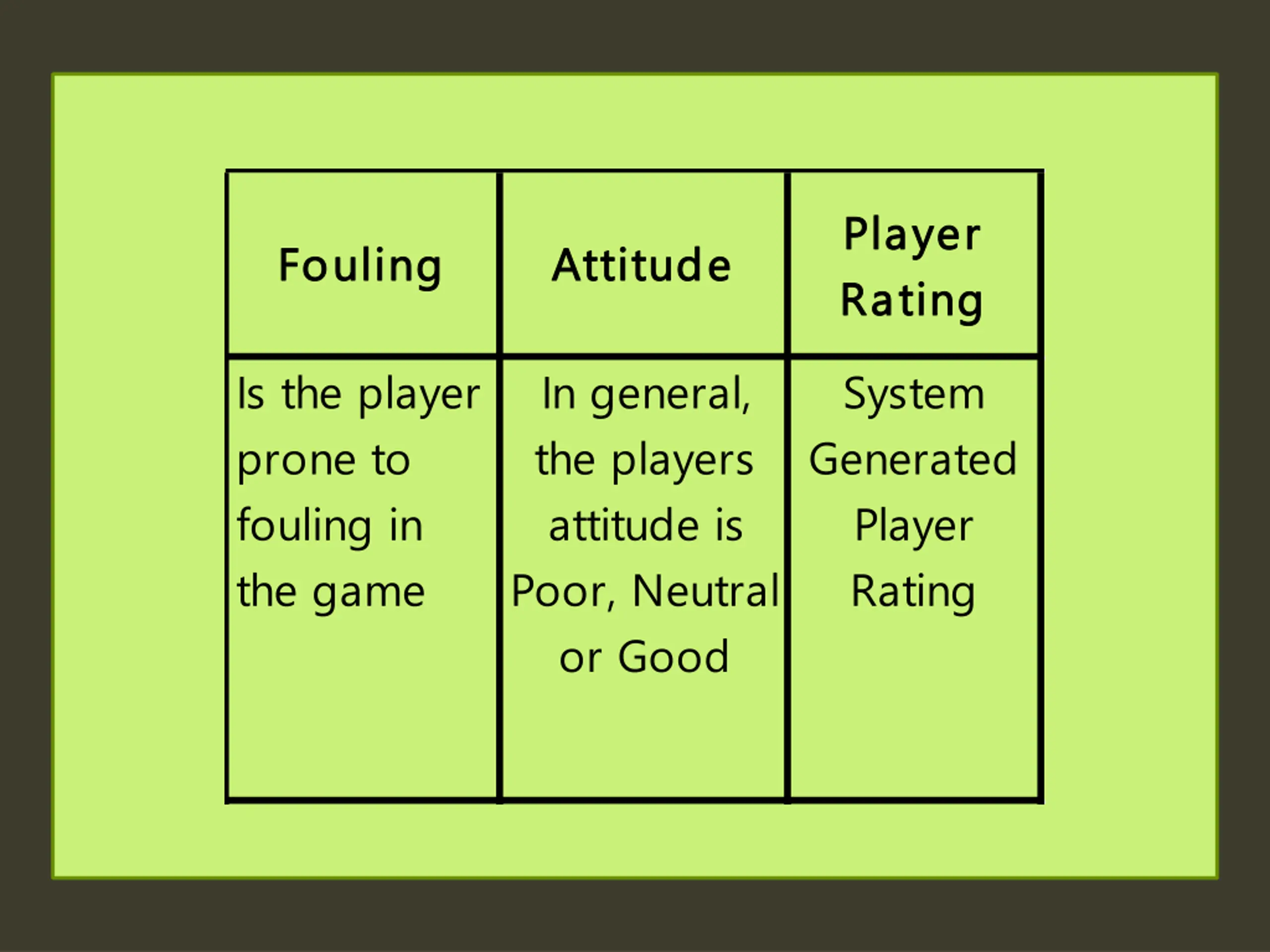 Player Player Rating Rating Fouling Fouling Attitude Attitude Is the player prone to fouling in the game In general, the players attitude is Poor, Neutral or Good System Generated Player Rating