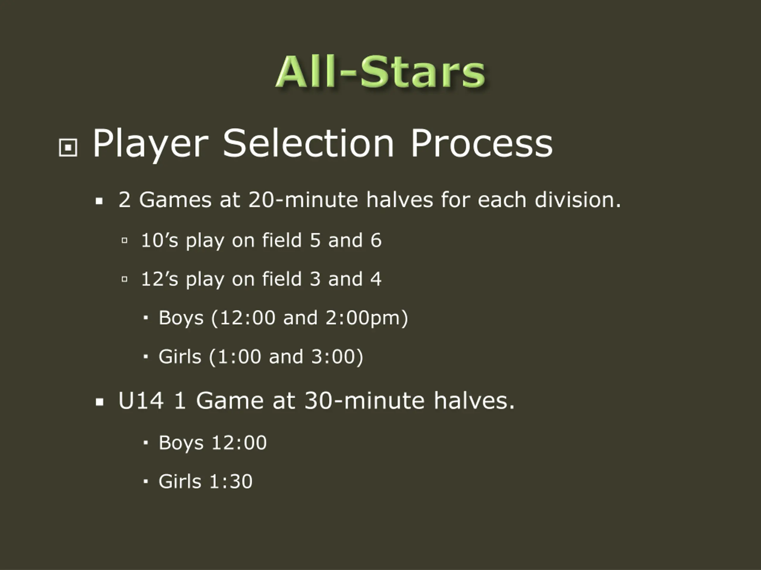 Player Selection Process 2 Games at 20-minute halves for each division. 10 s play on field 5 and 6 12 s play on field 3 and 4 Boys (12:00 and 2:00pm) Girls (1:00 and 3:00) U14 1 Game at 30-minute halves. Boys 12:00 Girls 1:30