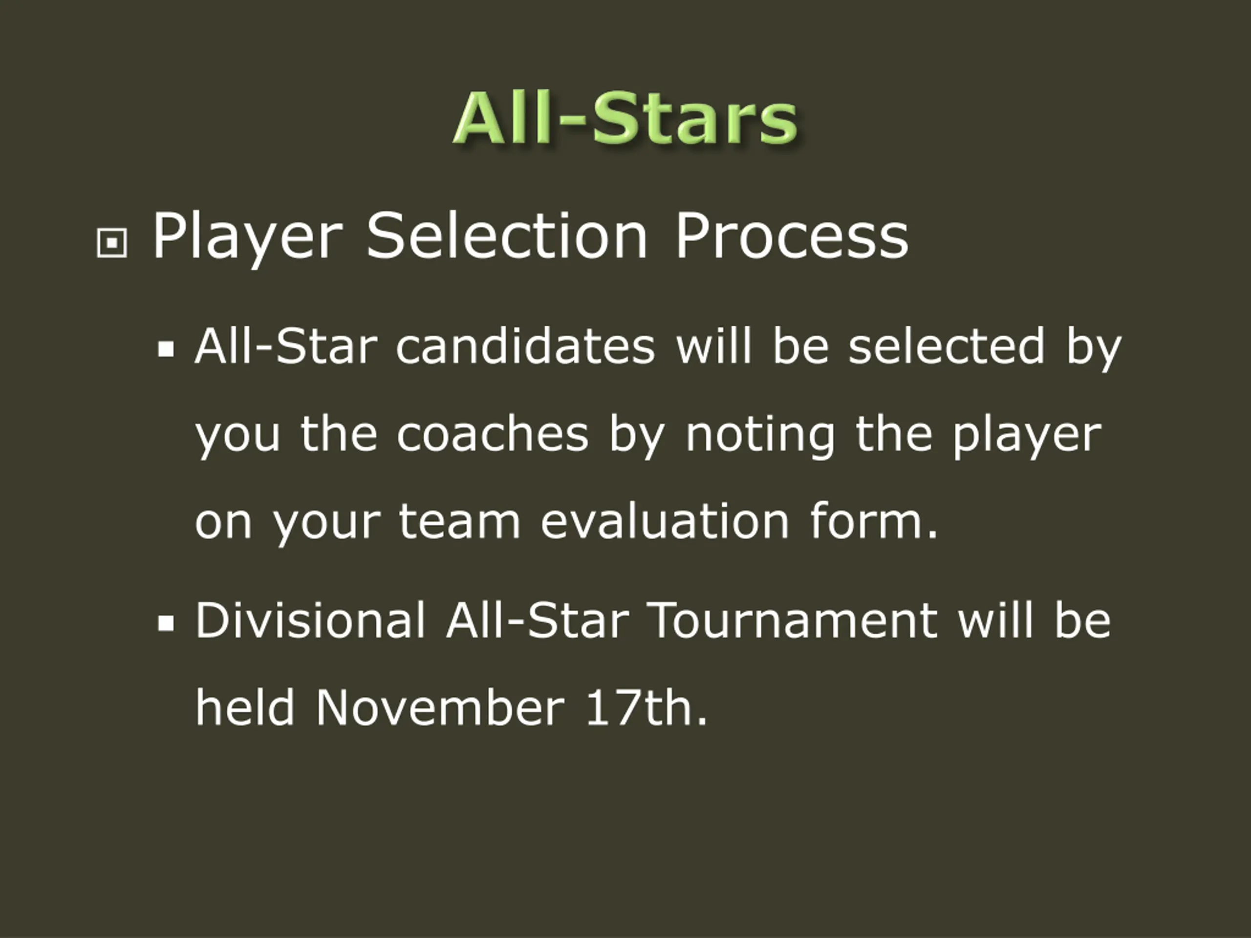Player Selection Process All-Star candidates will be selected by you the coaches by noting the player on your team evaluation form. Divisional All-Star Tournament will be held November 17th.