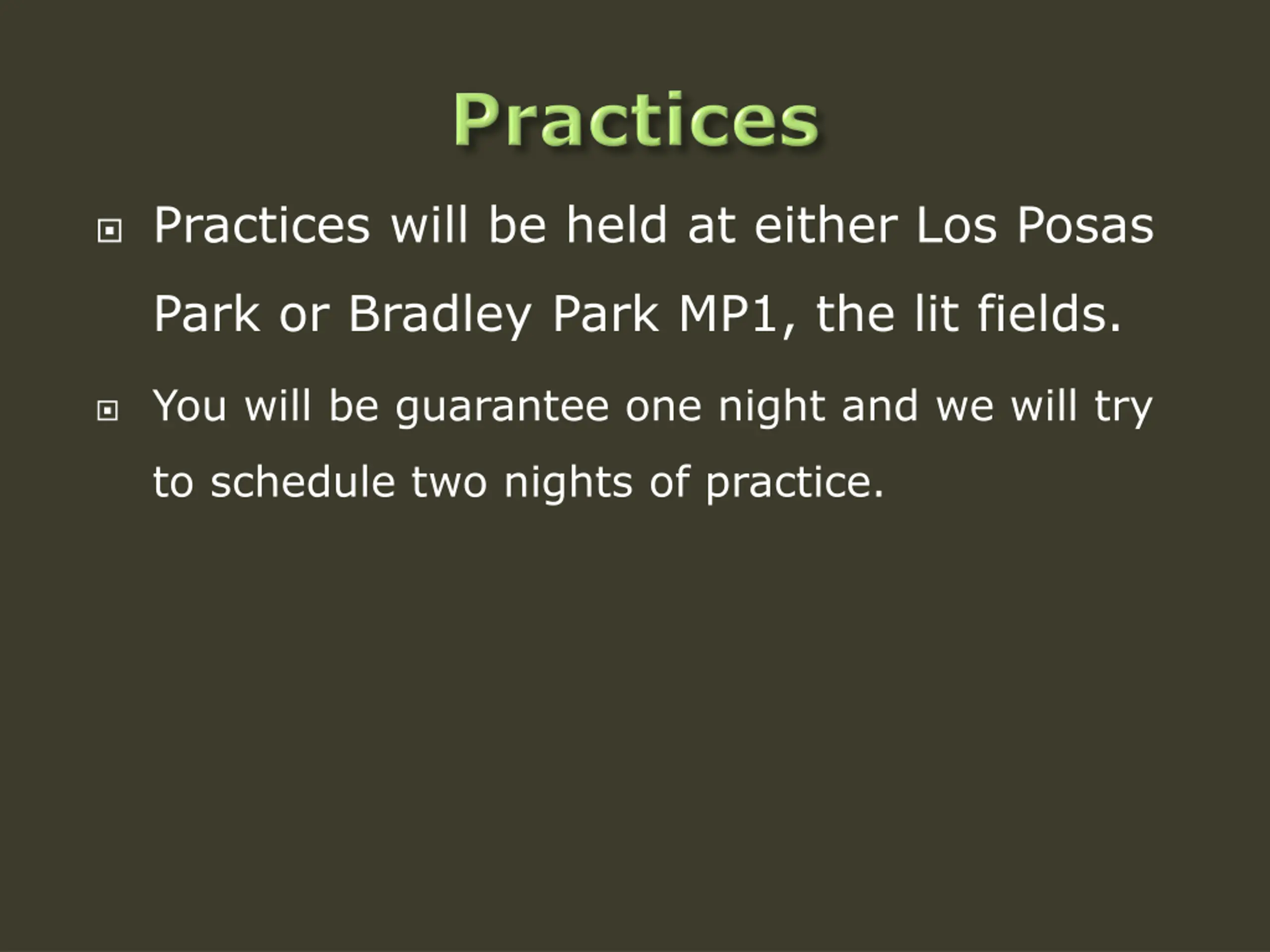 Practices will be held at either Los Posas Park or Bradley Park MP1, the lit fields. You will be guarantee one night and we will try to schedule two nights of practice.