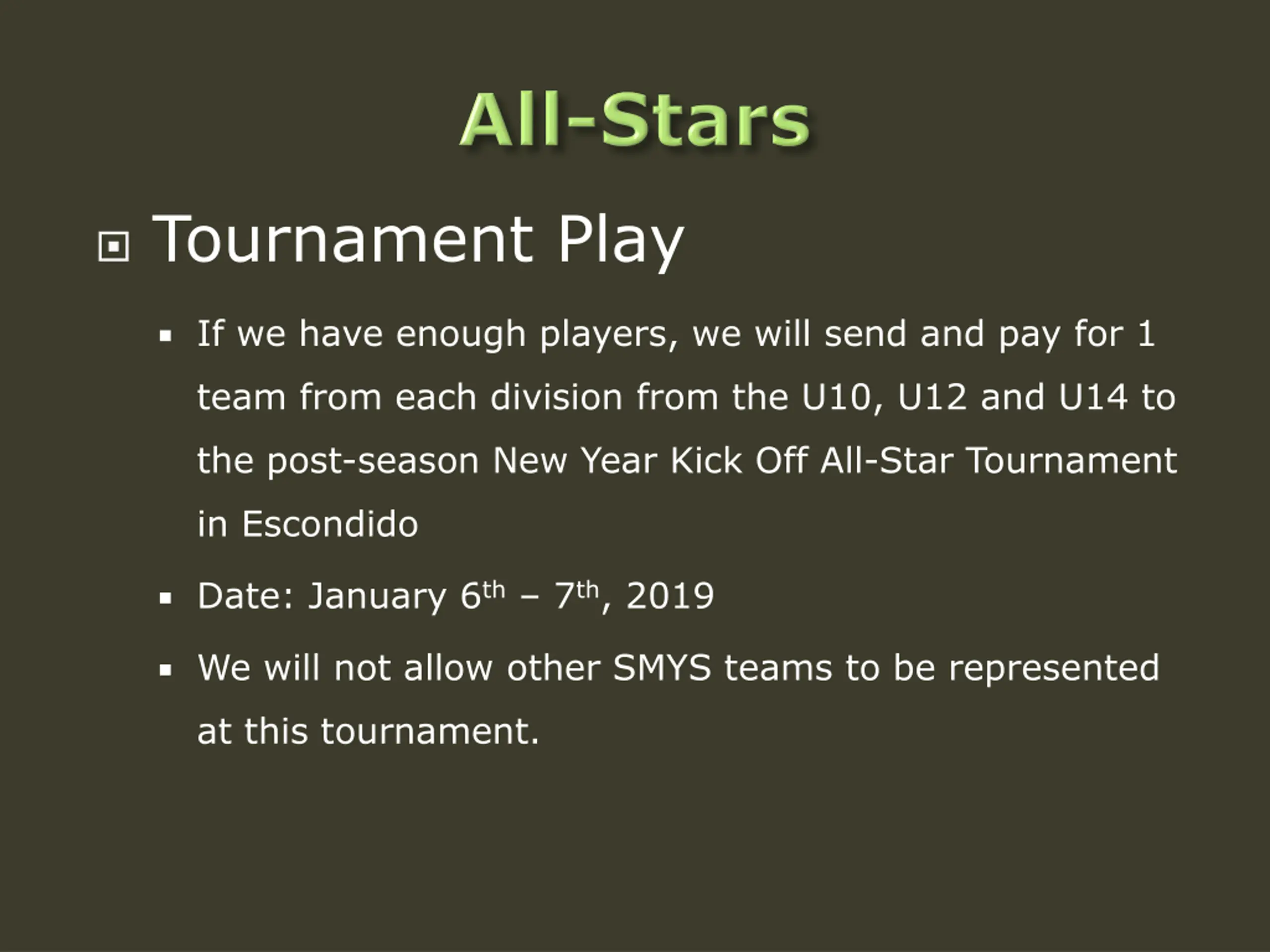 Tournament Play If we have enough players, we will send and pay for 1 team from each division from the U10, U12 and U14 to the post-season New Year Kick Off All-Star Tournament in Escondido Date: January 6th 7th, 2019 We will not allow other SMYS teams to be represented at this tournament.