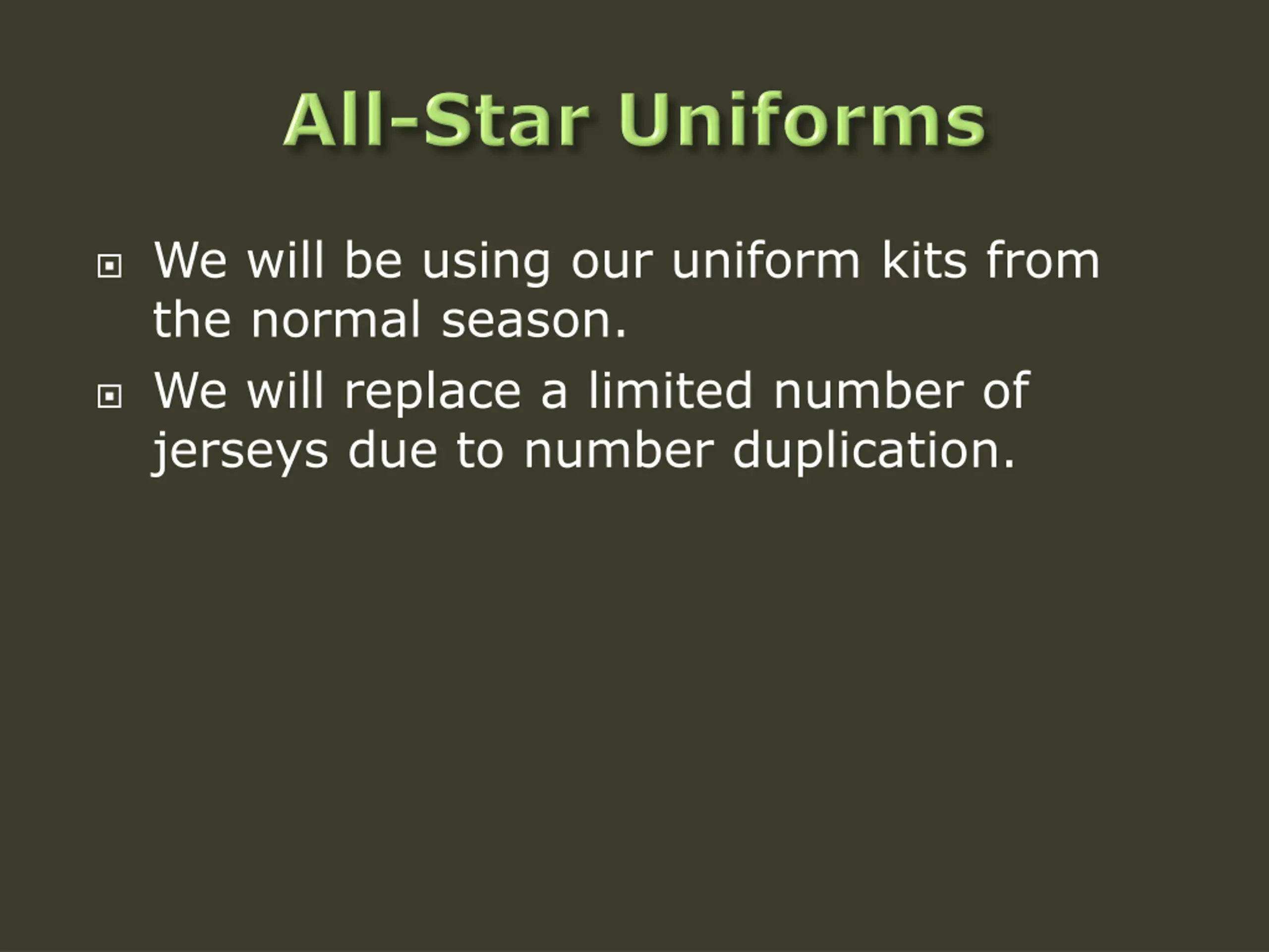 We will be using our uniform kits from the normal season. We will replace a limited number of jerseys due to number duplication.