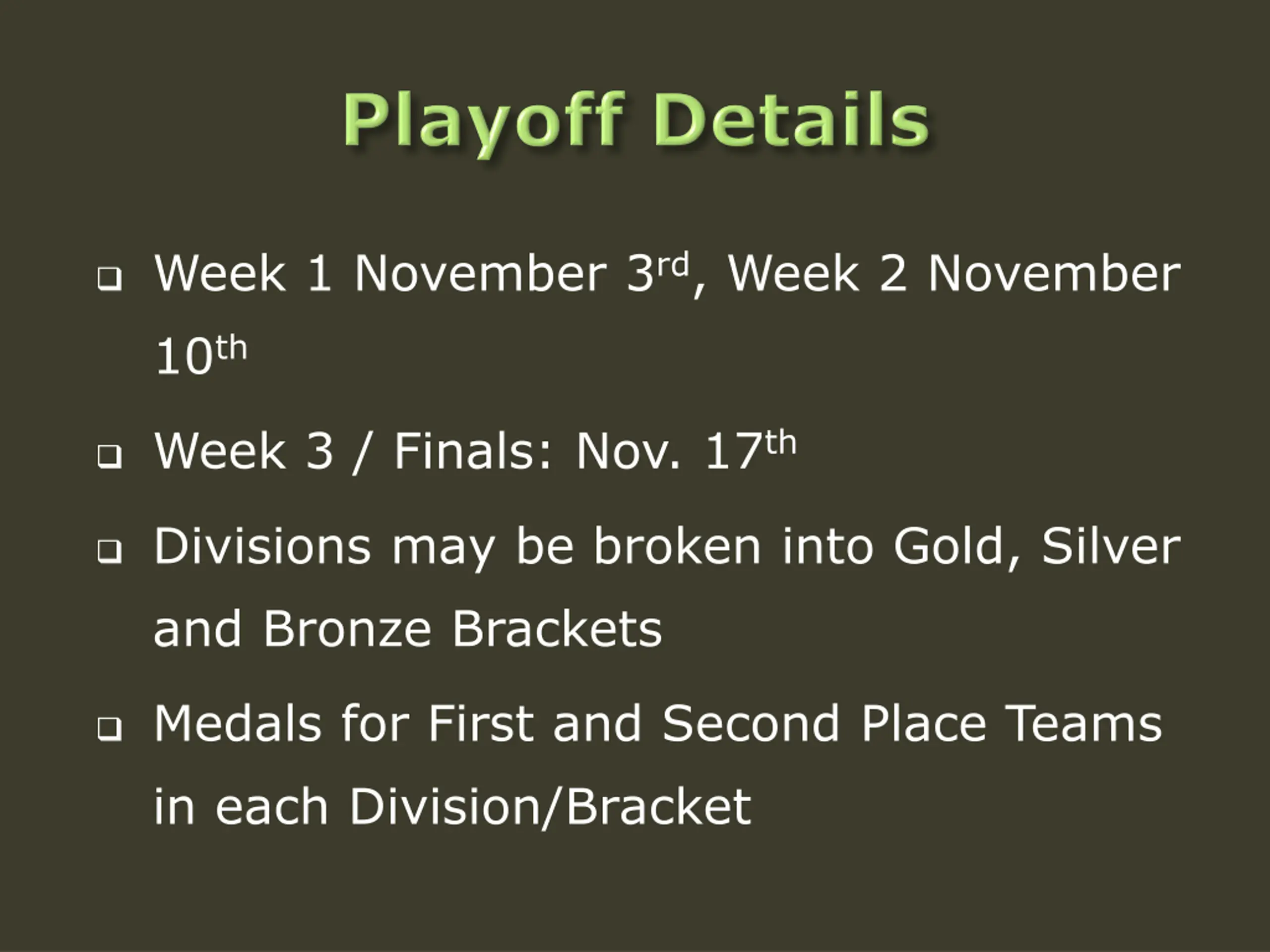 Week 1 November 3rd, Week 2 November 10th Week 3 / Finals: Nov. 17th Divisions may be broken into Gold, Silver and Bronze Brackets Medals for First and Second Place Teams in each Division/Bracket