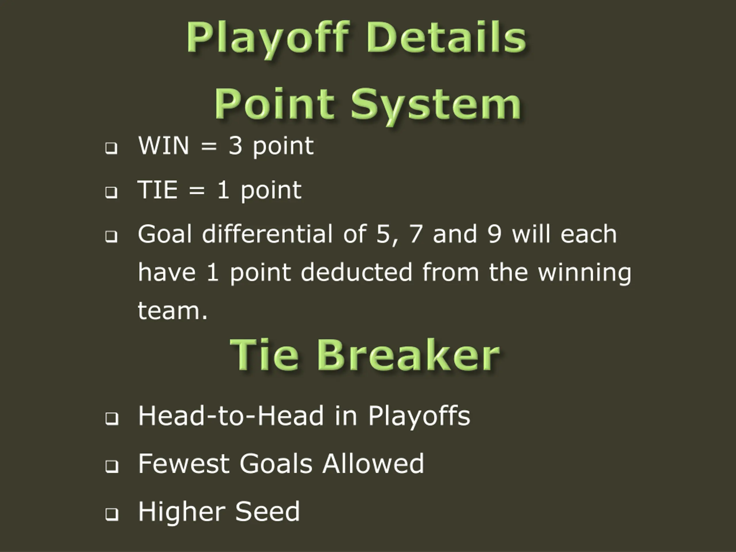 WIN = 3 point TIE = 1 point Goal differential of 5, 7 and 9 will each have 1 point deducted from the winning team. Head-to-Head in Playoffs Fewest Goals Allowed Higher Seed