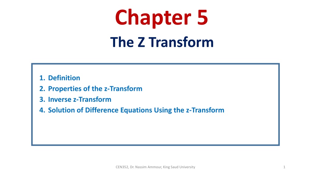 Chapter 5 The Z Transform 1. Definition 2. Properties of the z-Transform 3. Inverse z-Transform 4. Solution of Difference Equations Using the z-Transform CEN352, Dr. Nassim Ammour, King Saud University 1