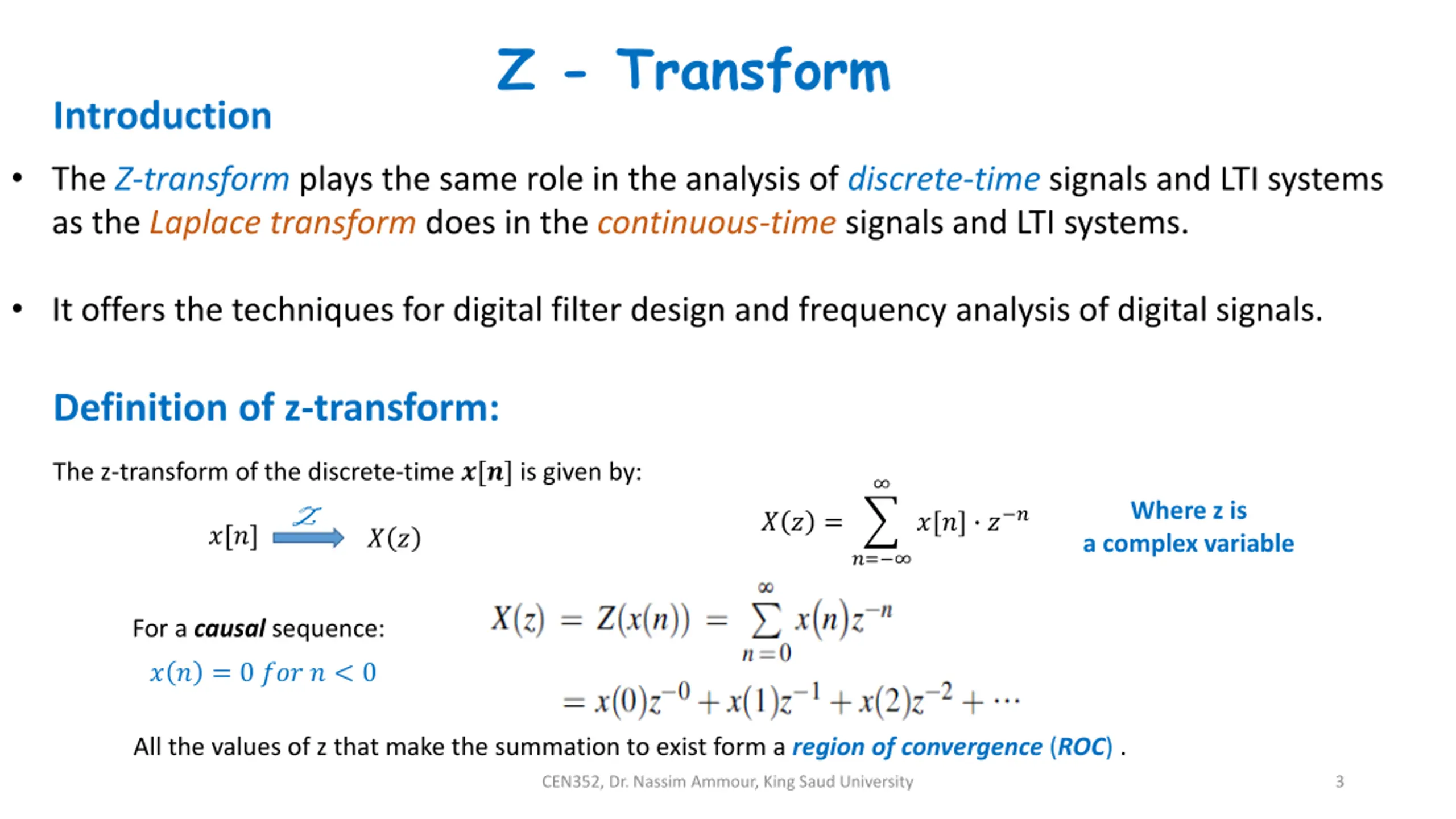 Z - Transform Introduction The Z-transform plays the same role in the analysis of discrete-time signals and LTI systems as the Laplace transform does in the continuous-time signals and LTI systems. It offers the techniques for digital filter design and frequency analysis of digital signals. Definition of z-transform: The z-transform of the discrete-time ?[?]is given by: Where z is a complex variable Z ?[?] ? ? ? ? = ?[?] ? ? ?= For a causal sequence: ? ? = 0 ??? ? < 0 All the values of z that make the summation to exist form a region of convergence (ROC) . CEN352, Dr. Nassim Ammour, King Saud University 3