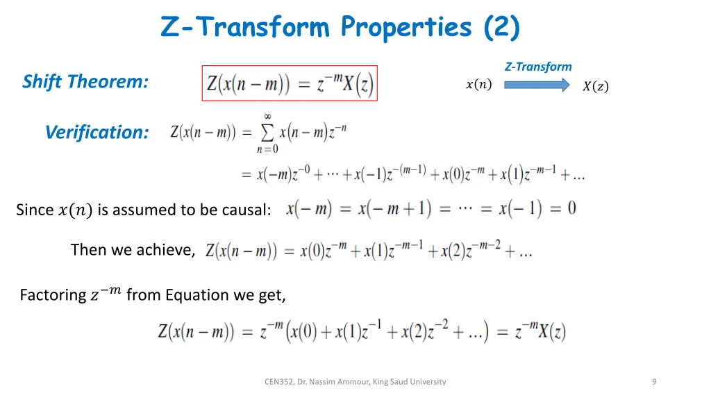 Z-Transform Properties (2) Z-Transform Shift Theorem: ? ? ? ? Verification: Since ?(?) is assumed to be causal: Then we achieve, Factoring ? ?from Equation we get, CEN352, Dr. Nassim Ammour, King Saud University 9