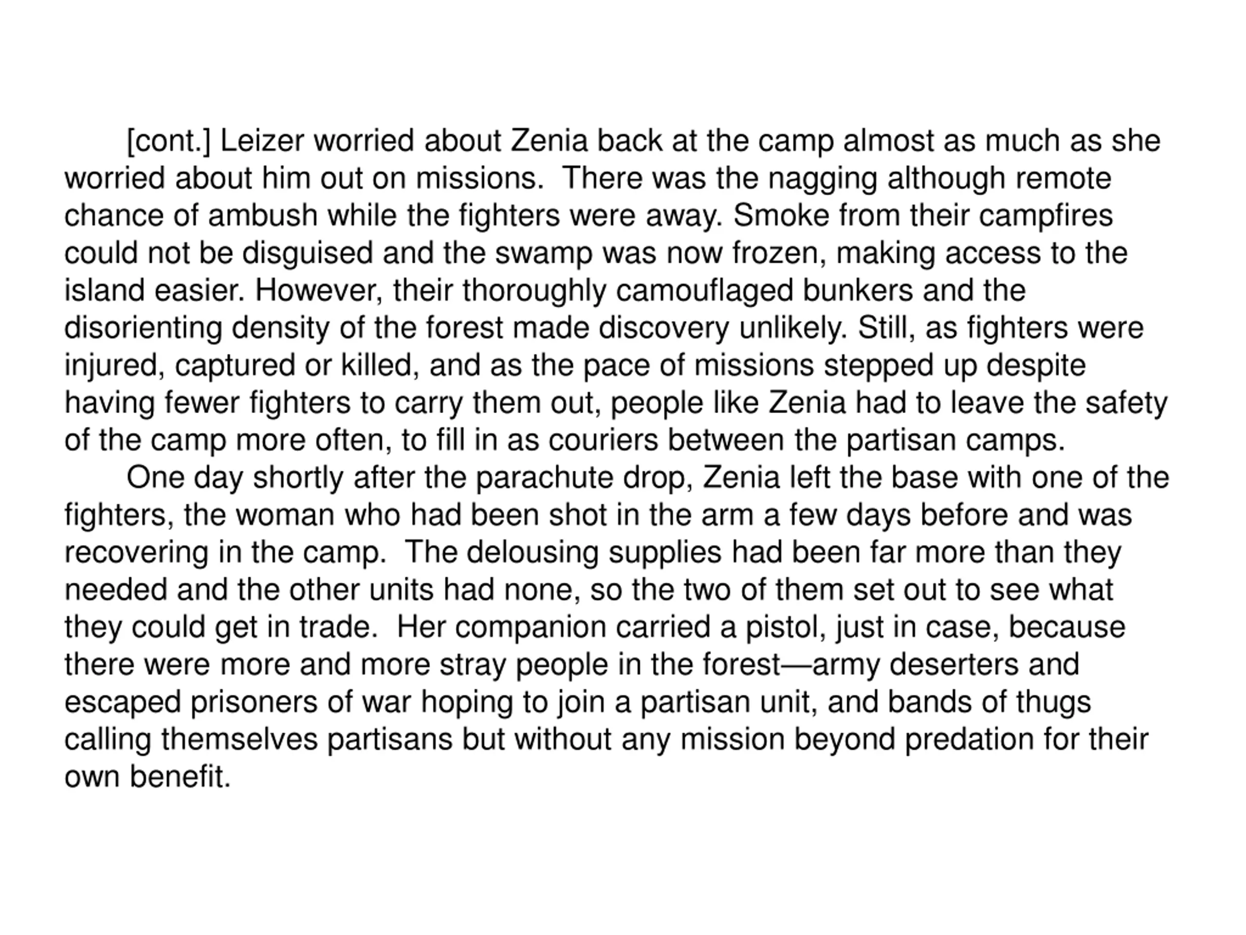 THE SAME PASSAGE REVISED BY MICHAEL BART One day in January 1944, Zenia stood in a clearing and watched as the small parachutes descended from Soviet planes through a pale gray sky. Earlier, AK partisans had been spotted nearby, so the pick-up had to be done swiftly. Zenia and several dozen others ran toward the containers as they fell, and within a few minutes they had scooped up almost everything. Behind them they heard gunfire and saw a small group of AK trying to drive them off from the last of the supplies. Zenia arrived back at the base camp unharmed, but a little shaken. She unpacked her supply bag that she was carrying on her shoulder. She held up one of the combs in her bag used for de-lousing There, caught in the bent and broken teeth, was a bullet. I m a lucky girl. She said to one the partisans. Being in the forest had become more dangerous because there were more and more stray people in the forest army deserters and escaped prisoners of war hoping to join a partisan unit, and bands of thugs calling themselves partisans but without any mission beyond predation for their own benefit. [cont]